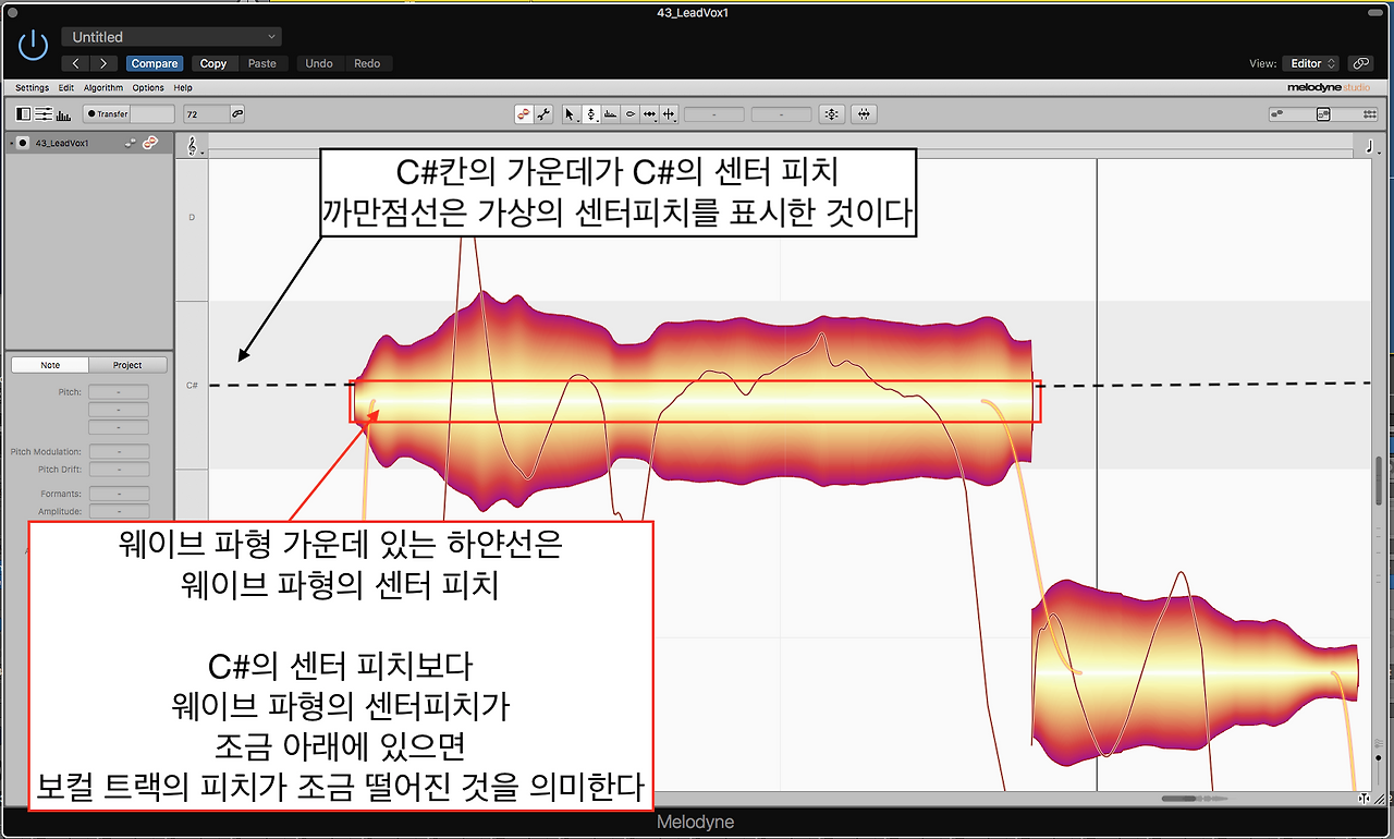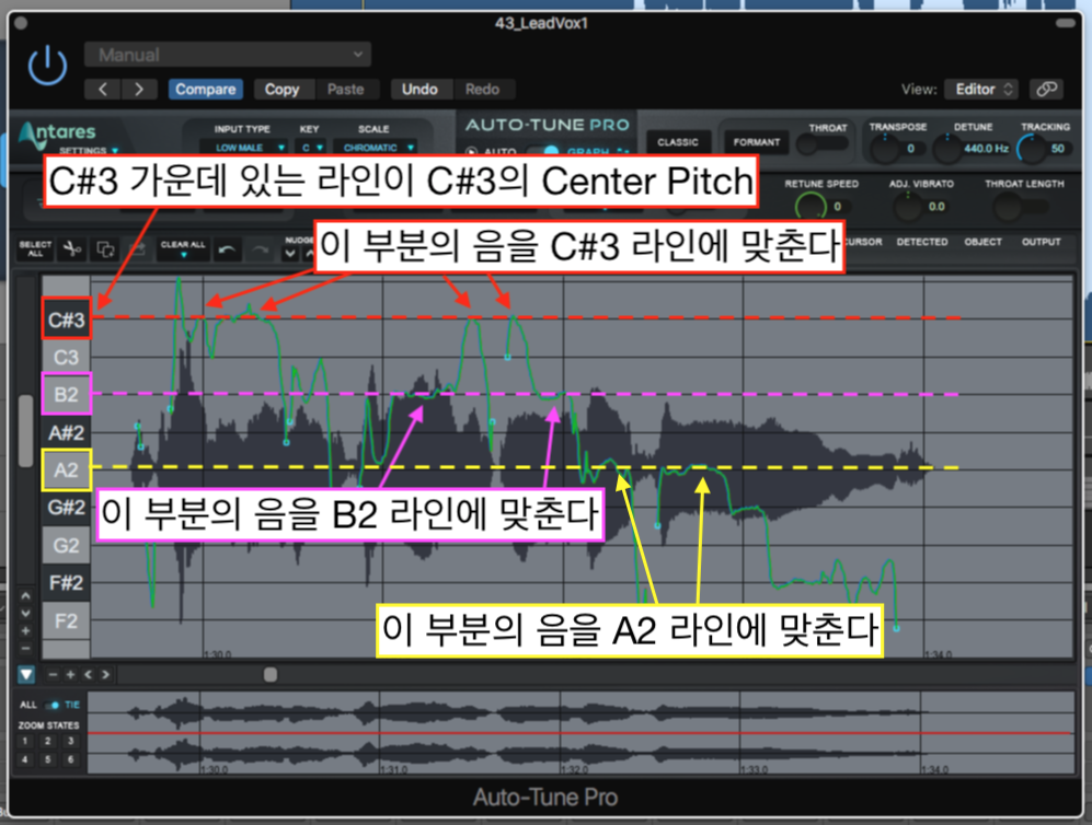 피치를 맞추는 방법은 오토튠 왼쪽 창에 적혀 있는 음표 혹은 피치를 보면서 보컬 트랙의 피치를 수정한다. 위의 그림에서 빨간 점선으로 표시된 라인은 C#3피치의 센터 피치이다. 완벽한 C#3 피치를 보여준다. 그럼 보컬 트랙의 피치가 표시된 녹색선이 C#3 센터 피치 라인보다 높으면 피치가 높은 것이고, 녹색선이 센터 피치 라인보다 낮으면 피치를 낮게 부른 것이니 가급적이면 각 음의 센터 피치에 맞추는 것이 좋다. 하지만 모든 음을 정확하게 센터 피치에 맞추는 것이 꼭 좋은 것은 아니다. 사람이 노래를 할 때 곡의 분위기에 따라 센터 피치보다 살짝 높게, 혹은 살짝 낮게 노래하면서 곡의 분위기를 만들기 때문이다. 그러니 피치 수정을 하면서 가급적이면 센터 피치에 맞추되 가수의 표현을 최대한 살려야 하겠다. 그래서 피치 수정이 생각보다 까다롭다.