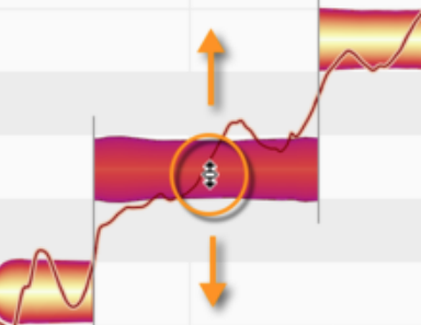 오렌지색선으로 표시되는 피치 전환 곡선은 음과 음사이의 연결 상태를 나타내는 곡선인데 곡선이 완만하면 음과 음이 부드럽게 연결되고 곡선이 가파르면 음과 음이 절도있게 연결되는 것을 보여준다. 피치 전환 곡선을 바꾸는 방법은 피치 툴을 선택한 상태에서 오렌지색의 피치 전환 곡선이 시작하는 지점으로 마우스 포인터를 옮기면 포인터의 모양이 바뀐다. 그럼 마우스를 클릭한 상태에서 마우스를 위로 움직이면 곡선이 완만해지고 반대로 마우스를 내리면 곡선이 급격해 진다. 그리고 피치 전환곡선으로 연결된 앞뒤의 빨간색 피치선이 피치 전환 곡선의 형태에 따라 바뀌며 음의 연결 상태가 수정된다.