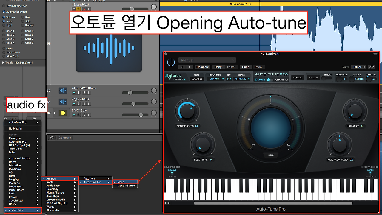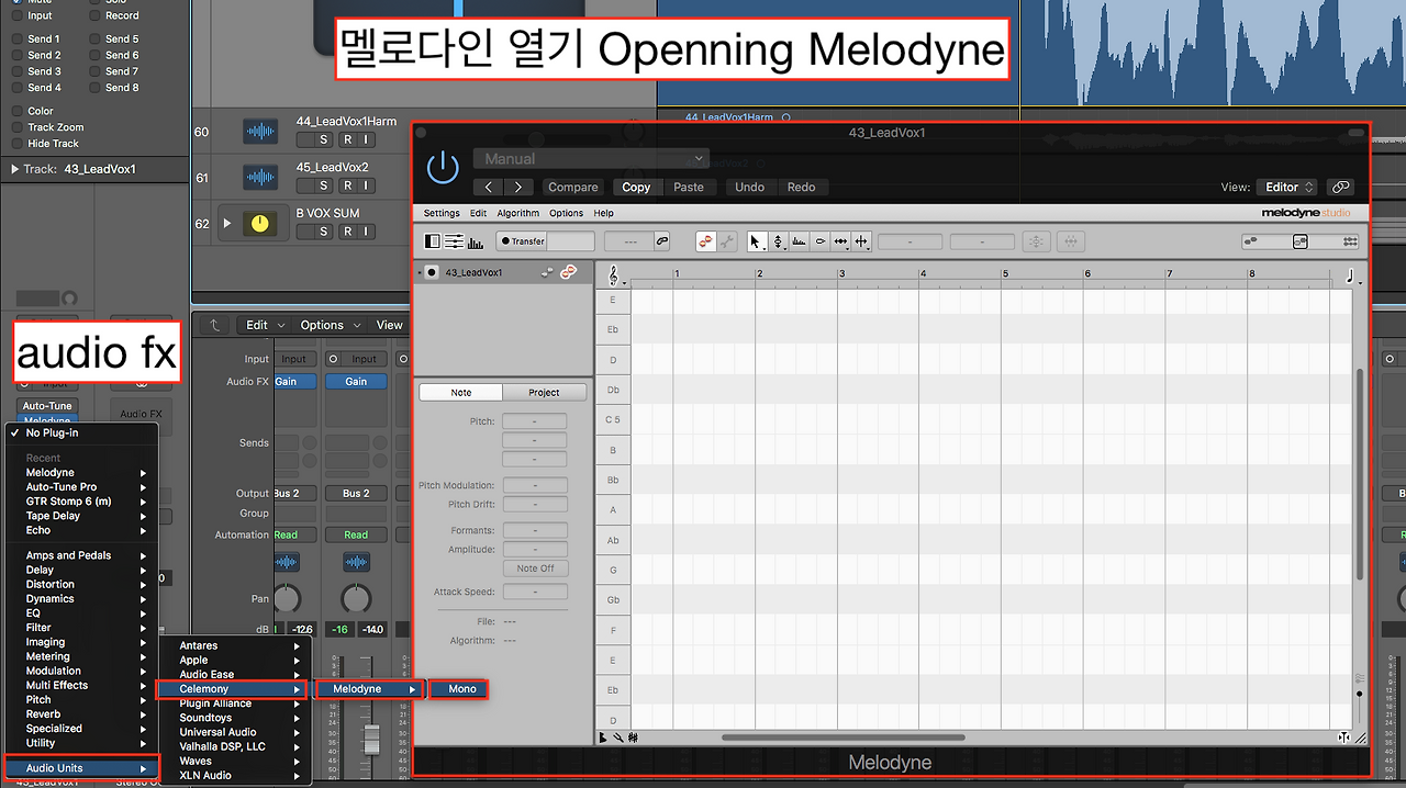 주의점 : 오토튠이든 멜로다인이든 튜닝 프로그램은 플러그인 가장 상단에 위치시켜야 한다. 플러그인은 위에서 아래로 순차적으로 적용되기 때문에 원래의 트랙이 음질의 손상 혹은 변화없이바로 튜닝 프로그램으로 입력되게 위치하는 것이 좋다.
