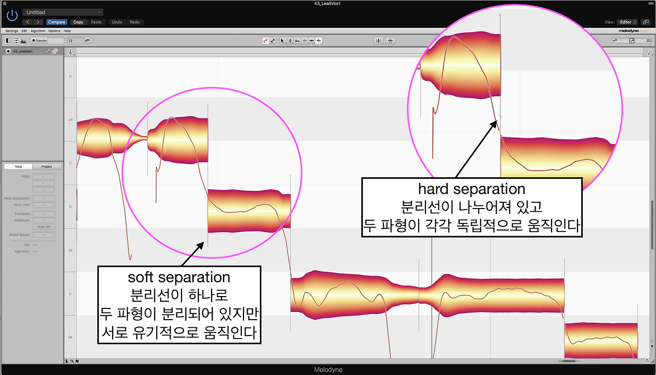 노트를 분리하는 방법은 소프트 세퍼레이션과 하드 세퍼레이션이 있다. 소프트 세퍼레인션은 분리지점의 분리선이 하나이고 하드 세퍼레이션은 자세히 보면 분리선 중간에 분리선이 나누어져 있다. 소프트 세퍼레이션을 사용하여 분리한 웨이브 파형은 비록 음은 나누어져 있지만 타이밍 조절을 할 때 두 파형이 유기적으로 서로에게 영향을 주며 조정되지만 하트 세퍼레이션은 두 파형이 독립적으로 분리되어져서 타이밍 조절시 서로에게 영향을 미치지 않고 독립적으로 조정할 수 있다. 소프트와 하드 세퍼레이션을 다시 돌리는 방법은 분리지점에서 노트 세퍼레인션 타입툴을 선택하고 분리지점을 더블클릭하면 된다.