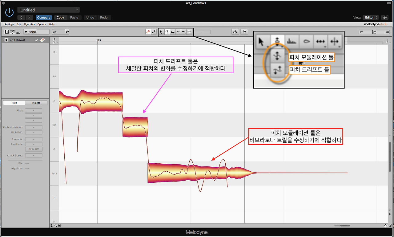 하지만 대부분의 경우 보컬의 피치 튜닝은 세밀하게 해야하기 때문에 세부적인 피치 조정은 option(alt)키를 누른 상태에서 피치를 수정한다. 사실 이 기능은 메인 툴에서 피치를 수정하는 것과 다를 것이 없지만 피치 툴과 메인 툴의 차이는 피치 수정은 물론 음과 음을 연결하는 피치 전환 곡선의 형태를 조정할 수 있다는 것이다.