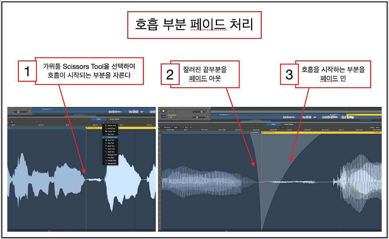 바보같은 이야기처럼 들리지도 모르나, 호흡은 노래하기 위한 필수적인 부분이다. 하지만 보컬 믹싱을 하다 보면 이 숨소리때문에 믹싱에 어려움을 겪기도 한다. 바로 컴프레싱때문인데, 작게 녹음된 노래 가사를 잘 들리게 컴프레싱을 하면 작은 숨소리도 같이 크게 되어 숨소리가 과도하게 커지는 경우가 발생한다. 이러한 문제를 줄이기 위해 크게 숨을 들이쉰 부분의 호흡에 페이드 처리를 하게 되면 숨소리가 과도하게 커지는 현상을 줄일 수 있다. 숨소리를 얼만큼 줄일지는 믹싱하는 사람의 마음일지 모르나 너무 과도하게 숨소리를 줄이게 혹은 없애 버리면 오히려 부자연스러워진다. 그러니 보컬 볼륨을 조금 크게 하여 모니터링하면서 조금 과하게 들리는 부분들을 중심으로 페이드 처리를 하면 된다.