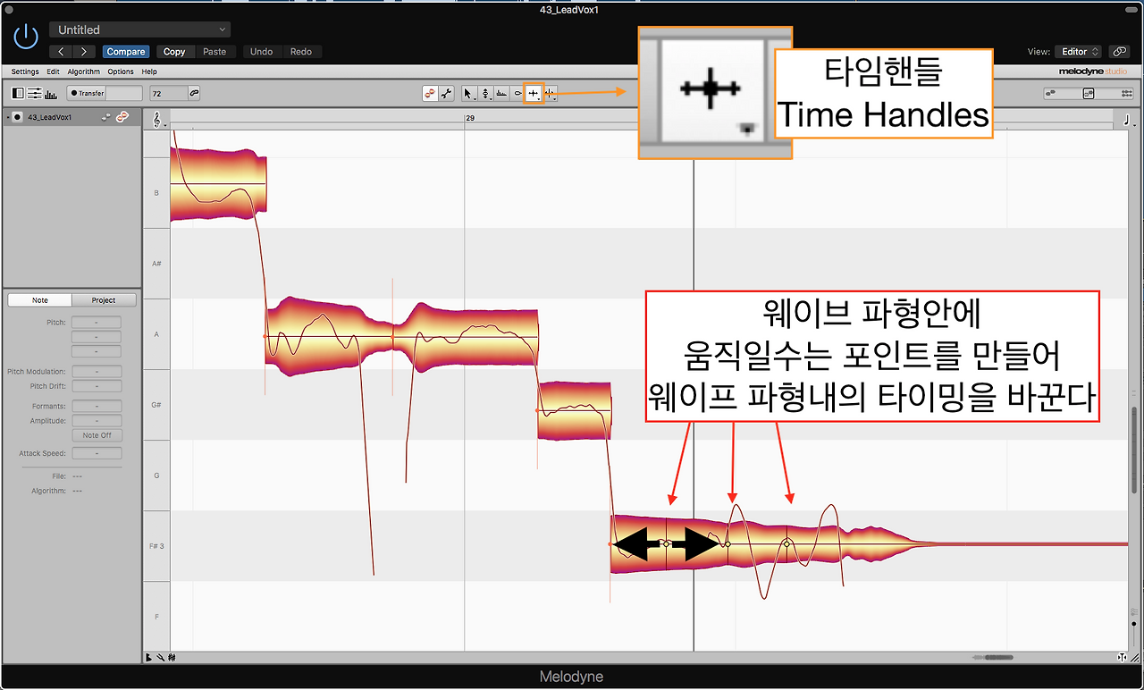 참고로 Algorithm 중 Universal은 트랙에 화성적 요소와 리듬적 요소가 공존하는 경우, 예를 들어 기존의 음원 전체를 멜로다인으로 Transfer 해서 피치나 타임을 조절할 때 효과적이다. Percussive는 피치를 조정할 필요없는 리듬악기 트랙의 리듬을 조정하기에 유리하다. Melodic은 보컬이나 바이올린등 단선율을 내는 악기의 튜닝에 적합하기 때문에 보컬 트랙의 피치 수정은 Melodic으로 하면 된다. Polyphonic은 화음악기의 피치와 리듬 수정에 좋다.