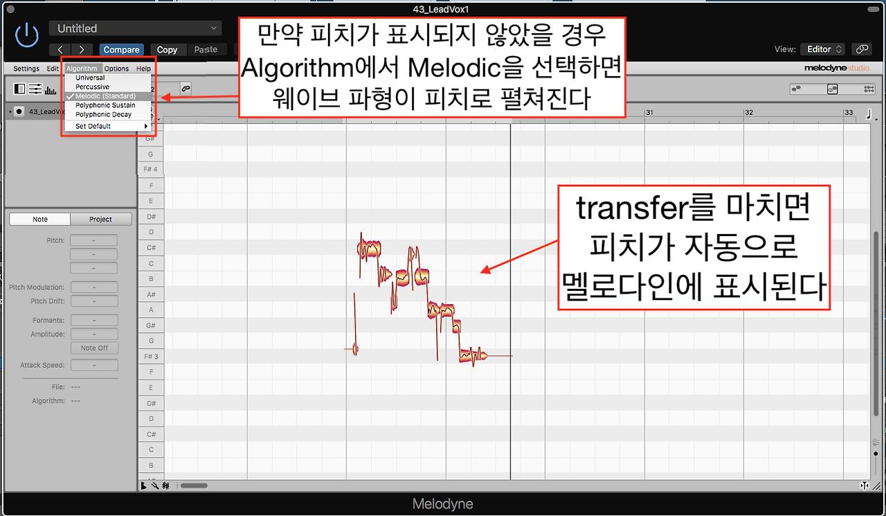 스페이스바를 눌러 재생을 마치면 보컬 트랙을 멜로다인으로 옮기는 작업인 Transter를 마친다. Transfer 할때 웨이브 파형으로 표시되는 트랙이 자동으로 피치를 펼쳐 보여준다. Transfer를 마쳤는데 피치로 펼쳐지지 않았다면 멜로다인 메뉴에서 Algorithm을 클릭하고 서브 메뉴중 Melodic을 선택하면 웨이브 파형이 피치로 펼쳐질 것이다.