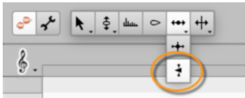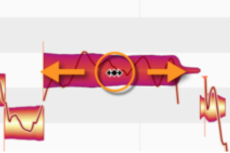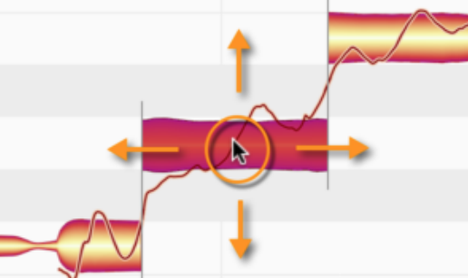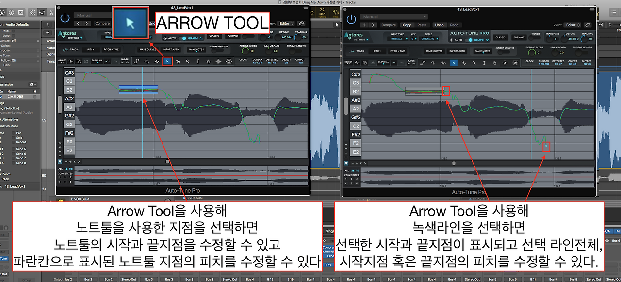 에로우 툴은 다양한 기능이 있다. 이전에 어떤 에디팅 툴을 사용해 피치를 수정하였는지에 따라 다른 기능으로 작동한다. 이전에 노트 툴을 사용하였다면 노트툴을 사용한 영역의 피치를 전체적으로 올리거나 내리며 피치를 수정할 수 있고 혹은 노트툴의 시작지점과 끝지점의 길이도 수정할 수 있다. 그리고 녹색라인으로 표시된 부분을 선택하면 라인의 시작과 끝 지점이 점으로 표시되고 녹색 라인 전체의 피치를 수정한다든지 혹은 시작 지점의 점을 선택하면 끝 지점을 고정한 상태에서 시작 지점을 움직이며 피치를 수정할 수 있고 반대로 끝 지점의 점을 선택하면 시작 지점을 고정한 상태에서 끝 지점을 움직이며 피치를 수정할 수 있다. 에로우 툴은 아마도 가장 많이 사용하는 에디팅 툴일 것이다.