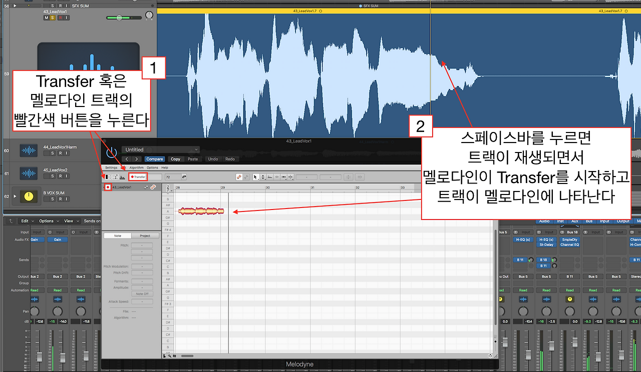 오토튠에서 보컬 트랙의 피치를 불러오는 과정을 Track이라 한다면 멜로다인은 Transfer라는 용어를 사용한다. 용어가 다르기는 하지만 두 용어 모두 트랙의 피치를 프로그램으로 불러오는 것을 이야기한다. 기본적으로 같은 기능이라 생각해도 무방하다.