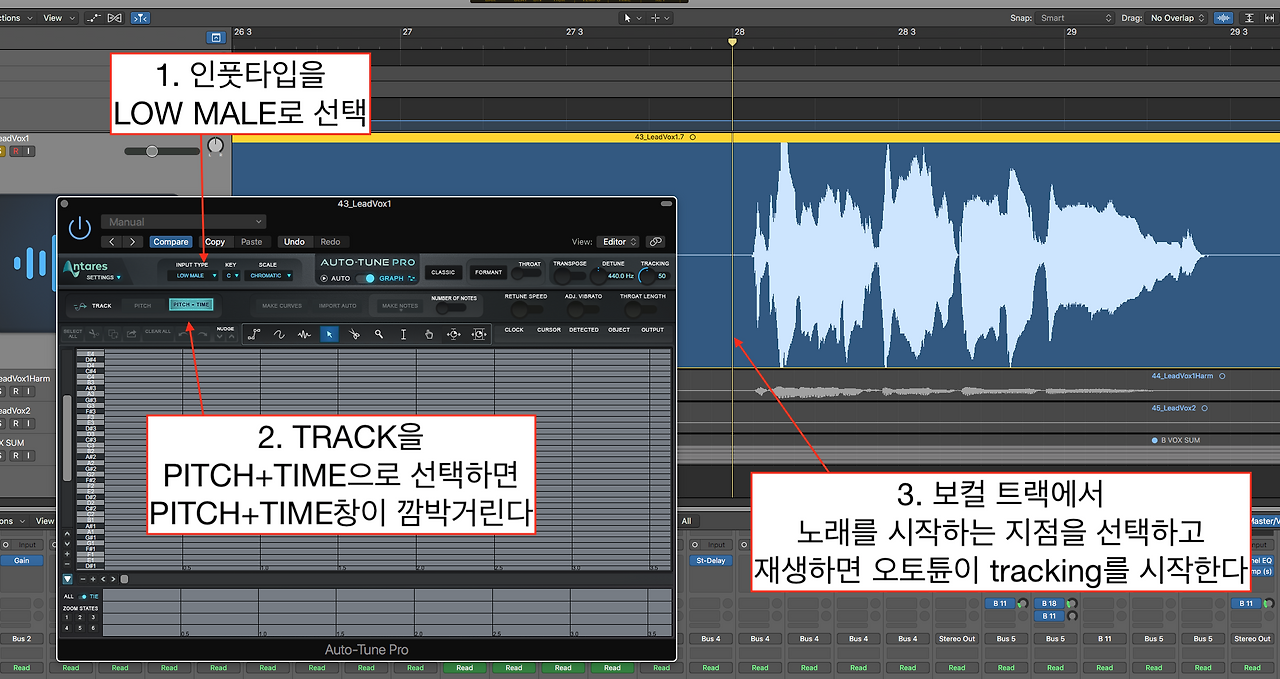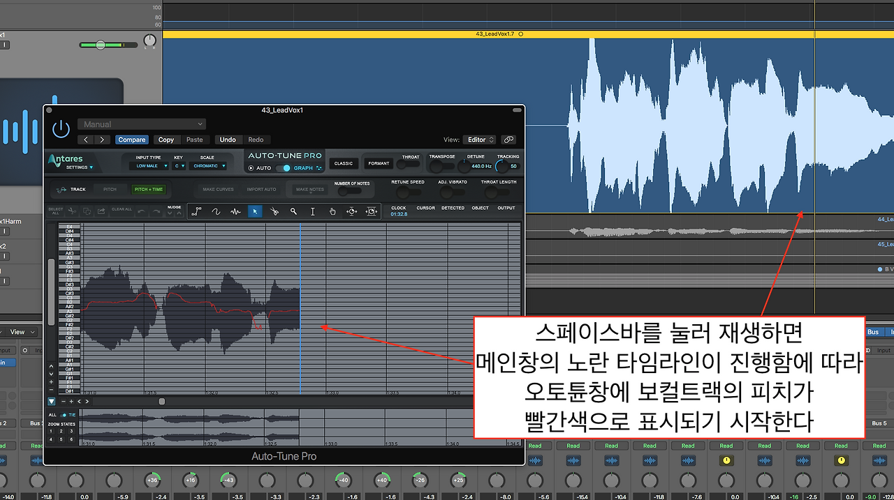 인풋타입을 LOW MALE로 선택하고 TRACK을 PITCH+TIME으로 선택하면 PITCH+TIME 창이 깜박거리기 시작한다. 오토튠이 트랙을 분석할 준비가 되었다는 뜻이다. 그럼 보컬 트랙의 시작지점을 선택한 후 스페이스바를 눌러 재생을 시작하면 오토튠은 트랙을 분석하기 시작하며 보컬 트랙의 피치가 그래프로 표시되기 시작한다.