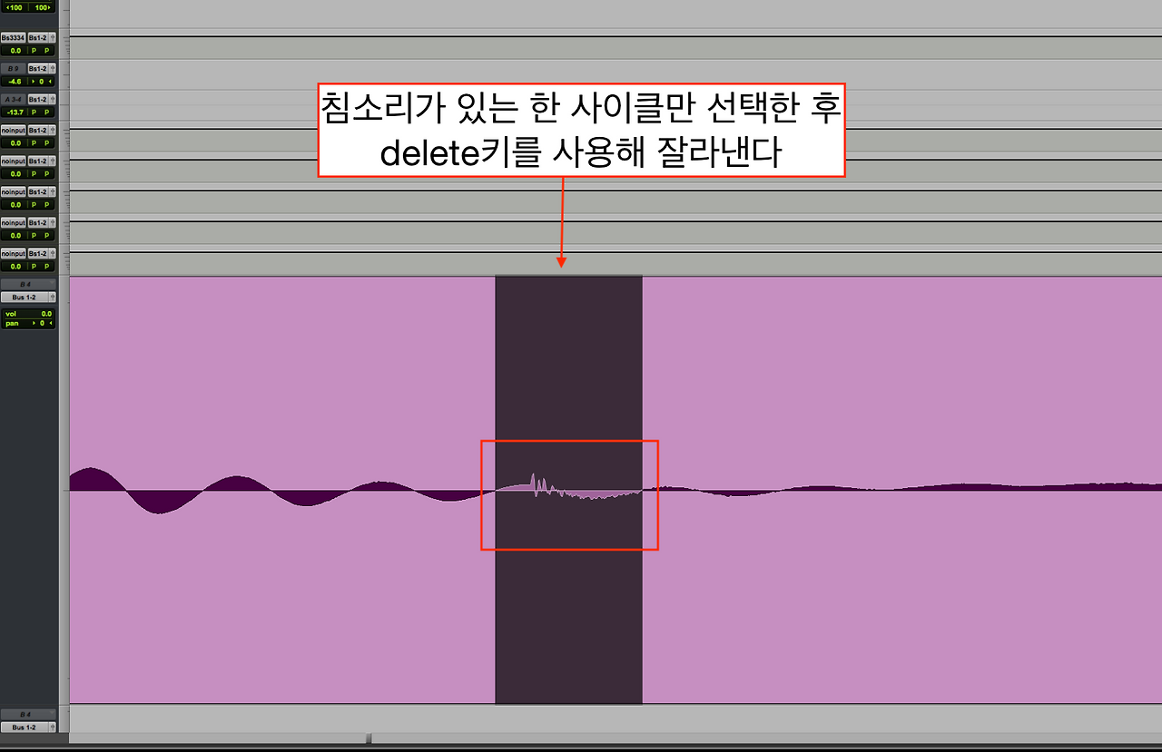 하지만 방법이 아주 없는 것은 아니니 너무 실망은 하지 말자. 먼저 침소리는 대부분 아주 짧은 시간에 생겼다가 사라진다. 웨이브 파일을 확대해서 보면 한 사이클(one cycle)안에 잠깐 나타난다. 이런 침소리는 감사하기까지 하다. 만약 이 침소리가 노래 끝자락에 있을 경우, 1) 그 부분을 선택해서 2) 잘라버리고 3) 뒤에 있는 웨이브 파일을 옮겨 4) 페이딩을 하면 끝이 난다.