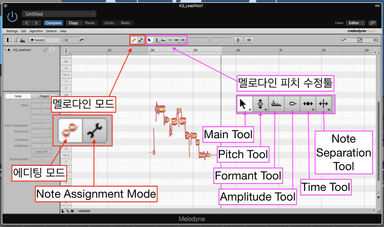멜로다인의 모드는 에디팅 모드와 노트 어싸인먼트 모드가 있지만 피치 수정은 에디팅 모드에서 한다. Note Assignment Mode는 실제 음의 변화를 주지는 않고 음들을 어떻게 배치할지 지정하는 모드이고 이 모드를 선택하면 오른쪽 툴의 모양이 바뀐다. 피치 수정만 한다면 굳이 사용하지 않는 모드이다.