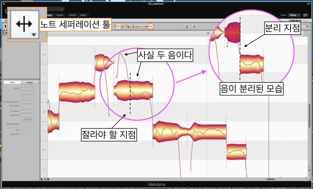 웨이브 파형을 분리하는 노트 세퍼레이션 툴은 멜로다인이 감지하지 못한 노트를 분리할 때 사용한다. 멜로다인이라고 트랙을 완벽하게 분석하지는 못한다. 두개의 음을 하나의 음으로 인지하여 하나의 웨이브 파형으로 표시한 경우, 그리고 이 음을 따로 수정해야 하는 경우 음을 분리하여 각각의 음을 튜닝하여야 한다. 이런 경우 노트 분리 툴을 이용한다. 노트 세퍼레이션 툴을 선택하거나 단축키를 사용하여 음과 음이 나누어져야 하는 지점으로 마우스 포인터를 옮겨 더블 클릭하면 음과 음이 나눠진다. 혹 분리해야하는 지점을 잘못 선택하여 되돌리고 싶다면 분리지점에서 다시 더블클릭하면 원래 형태로 돌아온다.