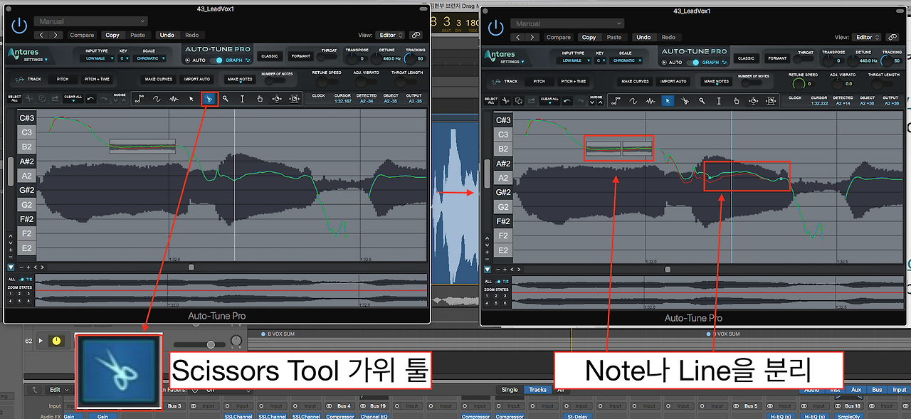 노트나 라인을 분리할 때 사용하는 가위 툴은 녹색선을 분리하여 특정한 구간의 피치를 수정할 때 사용한다.