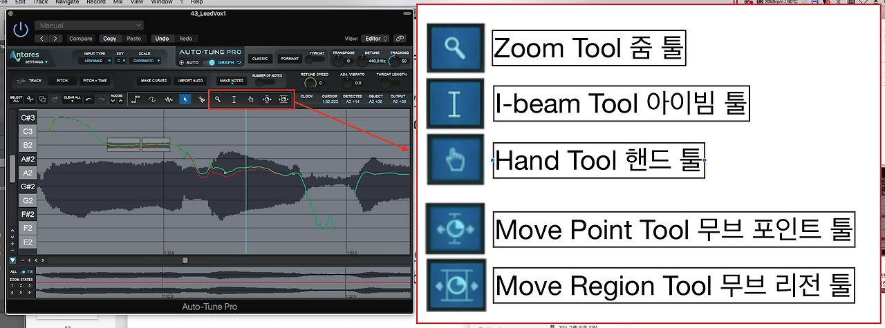 줌 툴은 오토튠의 에디팅 창에 표시된 파형 혹은 라인을 크게 혹은 작게 볼 때 사용하며 아이빔 툴은 오토튠의 에디팅 창의 특정 구간을 선택할 때 사용하며 핸드툴은 에디팅 창의 파형을 선택하여 보이는 구간을 옮길때 사용한다.