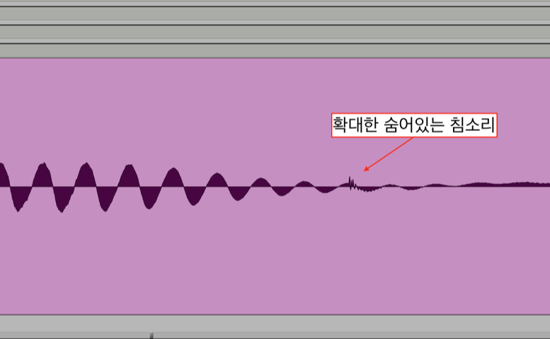 그런데 노래 중간에 침소리가 있다면 조금 더 까다롭기는 하지만 없애는 방법은 비슷하다. 먼저 침소리가 나는 부분을 찿아야 한다. 침소리의 파형은 대부분 노래의 파형보다 변칙(불규칙)적인 파형으로 나타난다. 그 이유는 침소리를 구성하는 주파수의 요소 때문이다. 이 정도의 힌트를 가지고 침소리가 나는 구간을 확대해 보면 다음과 같은 파형을 발견할 수 있다. 처음에 찾기가 힘들어도 하다보면 점점 더 쉬워진다