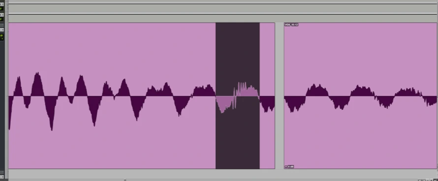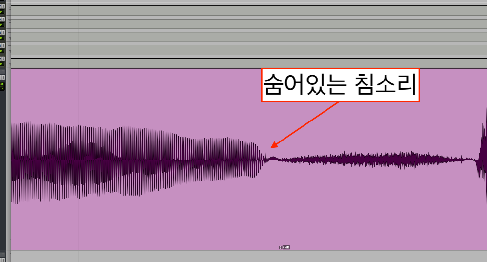 보컬 트랙 에디팅을 하다 보면 중간 중간 숨어 있는 침소리(mouth noise)는 정말 성가신 부분이다. 노래하지 않는 부분에 있는 침소리라면 간단하게 잘라내어 버리면 되지만 노래중에 섞여 있는 침소리는 아주 얄밉다. 무시하고 지나쳐서도 안된다. 믹싱때 보컬 볼륨이 커질수록 더욱더 선명하게 들리기 때문이다.