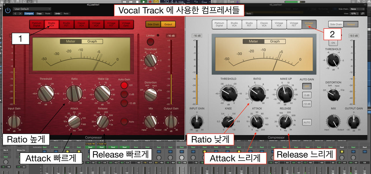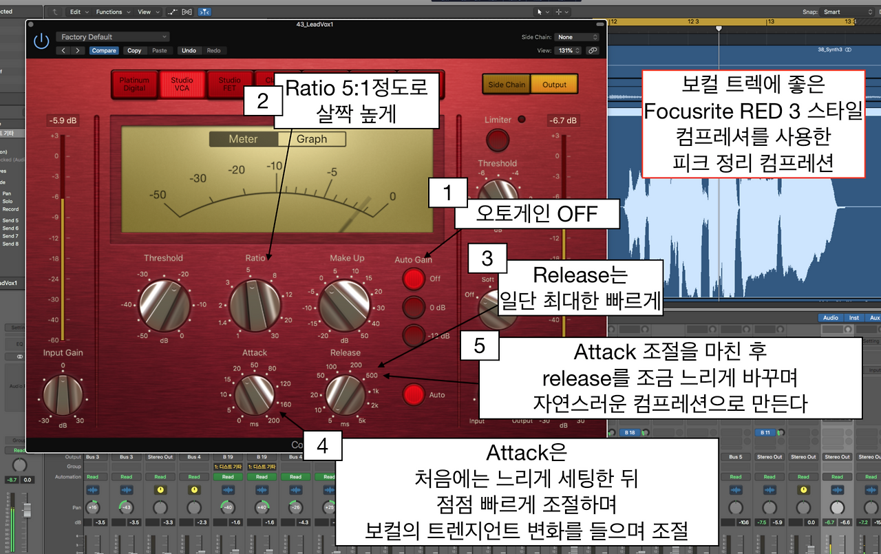 보컬의 트렌지언트 즉 보컬의 노래가 강하게 부각되는 부분만을 조금 약하게 만드는 컴프레션이다. 보컬의 피크 부분을 정리하는 세팅이다. 보컬의 트렌지언트 즉 피크를 자연스럽게 잡는 방법으로 컴프레셔의 바늘이 -5정도로 움직이게 다른 말로 게인 리덕션(gain reduction)이 약 -5dB정도 되게 조절해 보자.