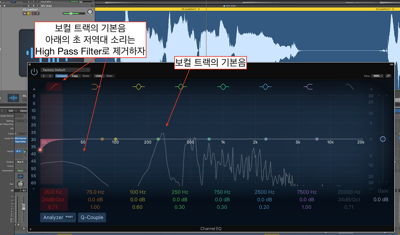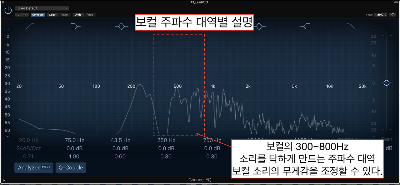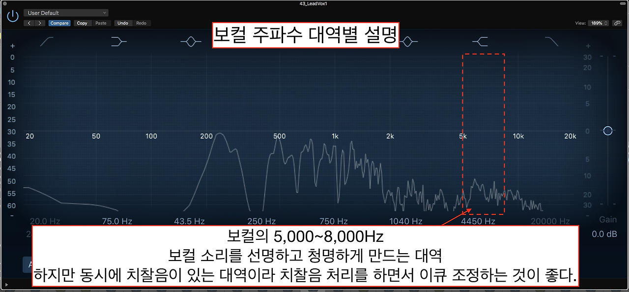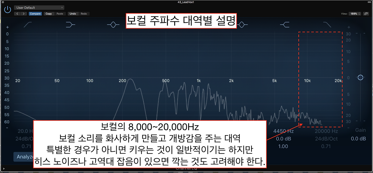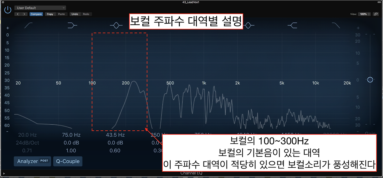 40~100Hz처100Hz이하의 영역대는 보컬의 목소리에서 만들어지는 영역대라고 보는 것 보다 'ㅂ'이나 'ㅍ'발음을 할때 발생하는 파열음이나 외부 소음 혹은 잡음에 의해 만들어진다. 그렇기 때문에 앞서 보컬 이퀄라이저를 이야기하면서 이 영역대를 깍아 낸 것이다.