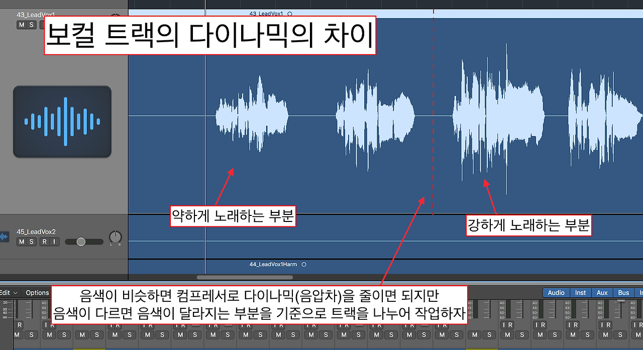 보컬 트랙을 다이나믹이 차이나는 지점으로 나누어 작업하면 좋은 점