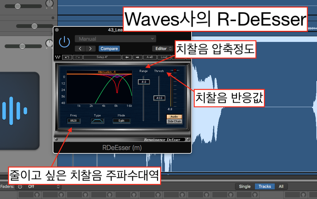 치찰음은 남성과 여성의 주파수 대역이 다르고 보컬마다 주파수와 정도의 차이가 있기 때문에 보컬에 맞게 개별적으로 세팅하여야 한다. 그리고 Range로 표시된 치찰음을 줄이는 정도 역시 주의하며 조정해야 하는데 너무 적게 줄이게 되면 효과가 없고 너무 많이 줄이게 되면 발음이 선명하지 못하거나 트랙의 음색이 어두워지는 느낌을 주기 때문에 적당한 값을 보컬에 맞게 찾아야 한다. 그리고 반응값인 Threshold값 역시 Range와 연관성이 있으므로 미터를 보며 그리고 들으면서 적당한 값으로 조정하면 된다.