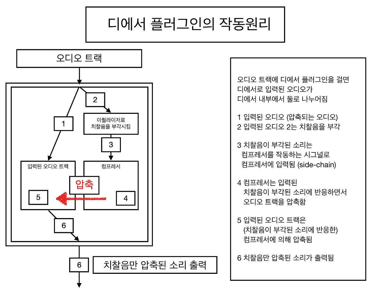 디에서가 컴프레셔였나? 그렇다 디에서는 컴프레서이다. 조금 더 자세하게 말하자면 이퀄라이저와 컴프레서가 내장된 프로그램이다. 디에서의 원리는 위의 그림에서 설명하는 것과 같이 오디오 트랙에 디에서를 걸면 디에서로 트랙의 신호가 입력된다. 이 때 디에서로 입력된 신호는 둘로 나누어지는데 하나는 입력된 신호 그대로 컴프레서에 의해 압축될 신호로 사용되고 다른 신호는 이퀄라이저로 치찰음 영역대를 부각시켜 컴프레서를 조정하는 신호로 사용된다. 디에서 내부에 있는 컴프레서는 입력된 오디오 트랙의 신호를 압축하지만 컴프레서를 조정하는 신호는 치찰음을 부각시킨 신호이다. 이렇게 입력신호가 둘로 나누어져 하나는 영향을 받는 신호 다른 하나는 조정하는 신호로 사용하는 방식을 사이드 체인 (Side-chain)이라 부른다. 그리고 디에서에서 치찰음을 부각한 신호와 같이 컴프레서나 플러그인을 조정하는 신호를 키 시그널 key signal이라 부르고 이 키 시그널을 따로 입력하는 것을 키 인풋 key input이라 부른다.