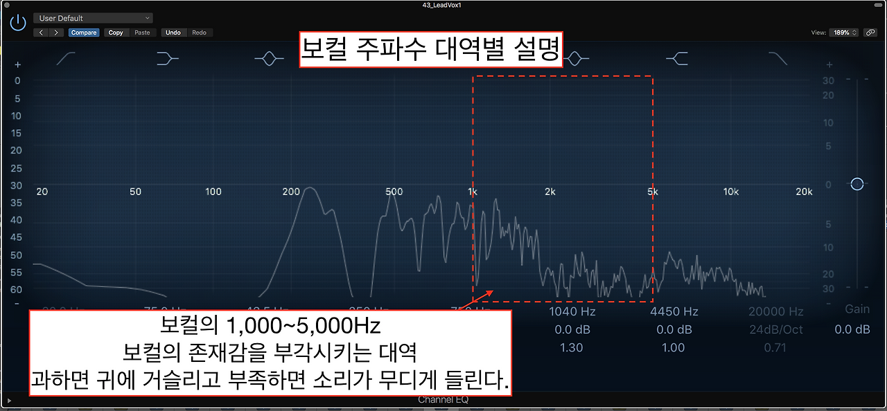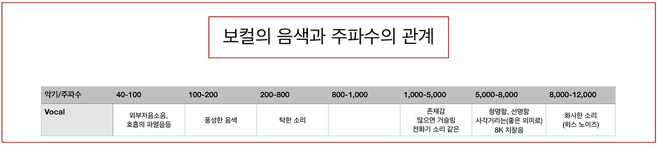 보컬의 음색을 잘 표현하기 위해서는 무엇보다 이퀄라이저의 사용이 중요하다. 좀 더 정확하게 말하자면 듣기 싫은 음역대를 낮추고 듣기 좋은 음역대를 키워주는 작업이 중요하다. 그리고 그 작업을 하기 위해서 이퀄라이저를 사용한다. 그러기 때문에 이퀄라이저의 사용이 중요하다 말할 수 있다. 그러기 위해서는 먼저 보컬의 일반적인 주파수 반응 혹은 특징에 대해 알 필요가 있다.