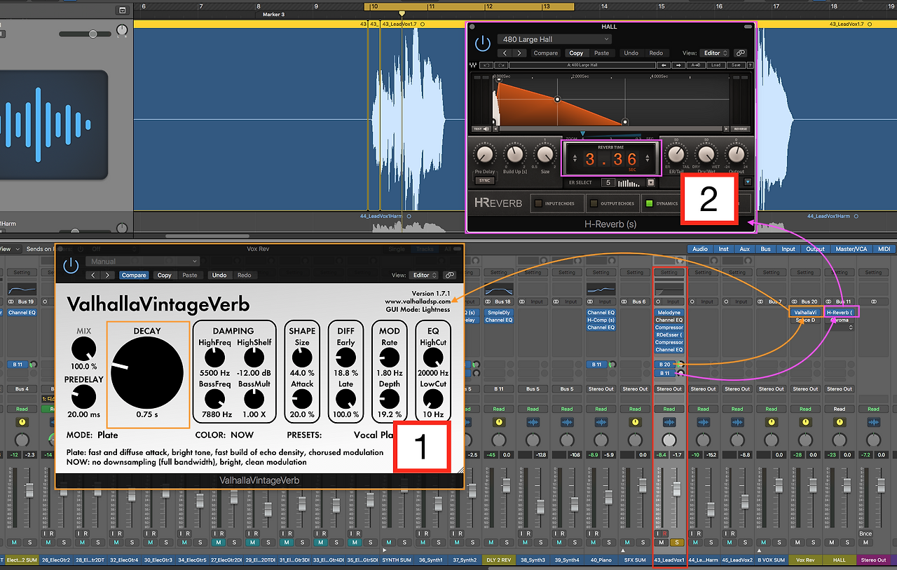 리버브 준비가 완료되었다면 보컬 트랙의 Sends를 사용하여 짧은 리버브부터 믹싱한다. 짧은 리버브는 들린다기보다는 느껴지는 부분이라 보컬에 긴 리버브부터 믹싱하게 되면 짧은 리버브가 긴 리버브 소리에 뭍여 잘 들리지 않게 되기 때문에 짧은 리버브를 필요 이상 많이 쓰는 결과를 만들게 된다. 그러므로 리버브 믹싱에 익숙하지 않은 사람이라면 꼭 짧은 리버브부터 믹싱하고 난 후에 긴 리버브를 사용하여 두 리버브의 차이를 인지하면서 믹스해 보자.