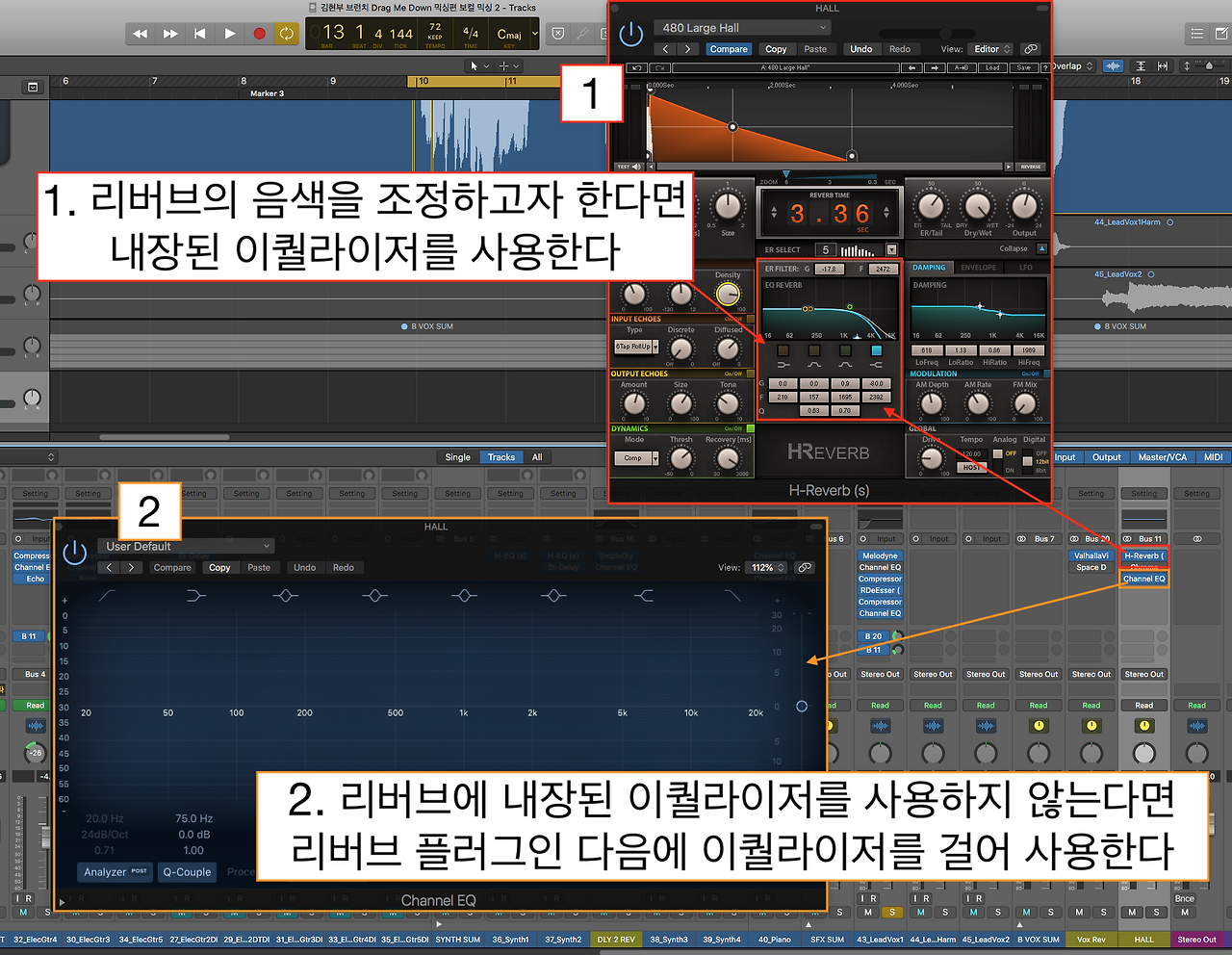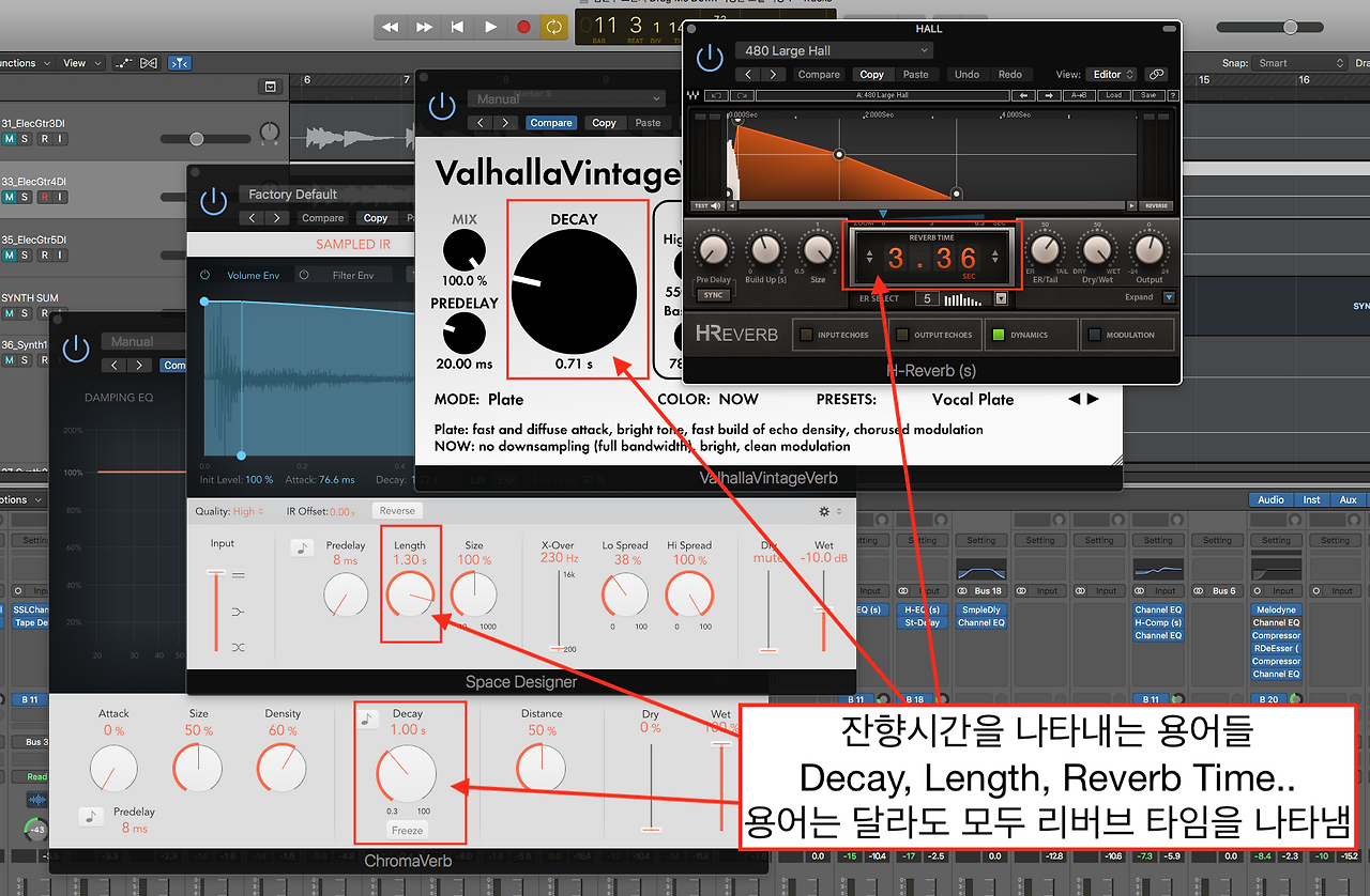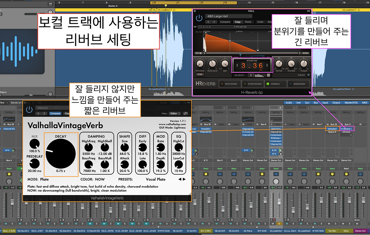자, 그럼 보컬 트랙에 짧은 리버브와 긴 리버브를 적용하여 보자.
