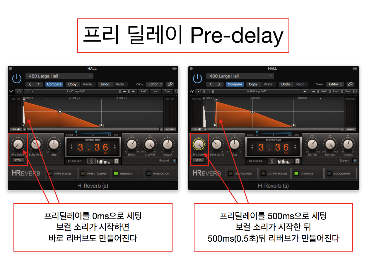 프리딜레이는 곡의 템포와도 연관성이 있기 때문에 몇몇 리버브들은 프리딜레이에 'SYNC'라는 옵션이 있다. 어쨌든 잘 느껴지지 않은 약간의 분리감을 주기 위해서는 약 20 ~ 35ms정도로 세팅하는 것이 좋다. 그리고 발라드같은 느린곡에서 리버브를 많이 사용해야 하는데 리버브 때문에 보컬의 선명도가 많이 떨어진다면 60~120ms정도로 프리딜레이 타임을 조정해도 괜찮을 것이다.