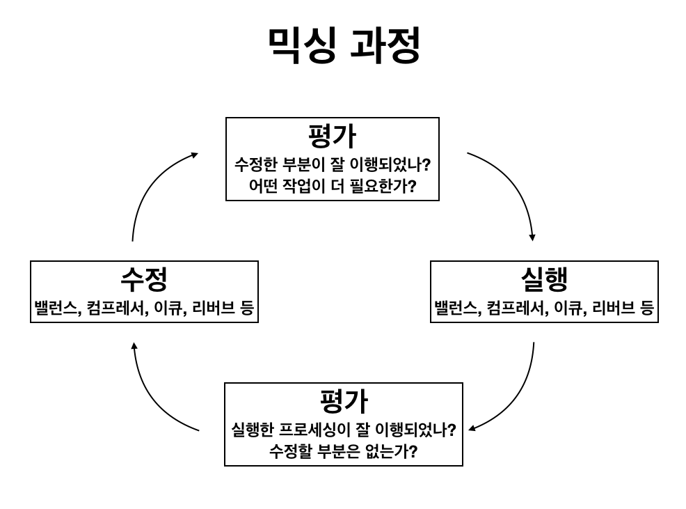 먼저 믹싱되기 전의 멀티 트랙을 듣고 필요한 작업을 한 후 그 작업이 잘 실행되었는지 평가한다. 그리고 수정해야 할 부분이 있다면 수정을 하고 난 후 다시 평가하고 평가하면서 수정한 부분의 작업이 잘 되었는지 확인하고 또 더 작업할 부분이 없는지 평가하여야한다. 그리고 필요한 부분을 다시 실행하는 무한 반복과 같이 반복되는 과정이 믹싱이라 볼 수 있다. 이 연마의 과정을 거치면서 믹싱의 완성도는 높아진다.