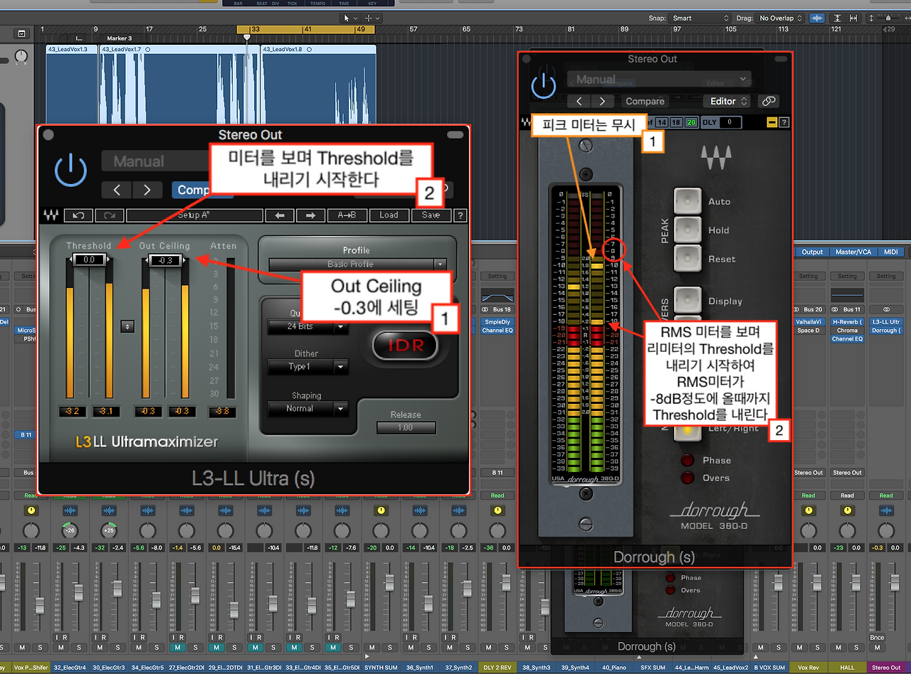 4. 미터의 RMS미터를 보며 RMS레벨이 -8dB정도가 되게 리미터의 Threshold를 내린다.