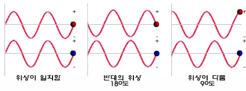 다음은 사인웨이브로 표시된 위상이 일치할때, 역위상일때 그리고 위상이 90도 어긋나 있을때를 나타내는 그림이다.