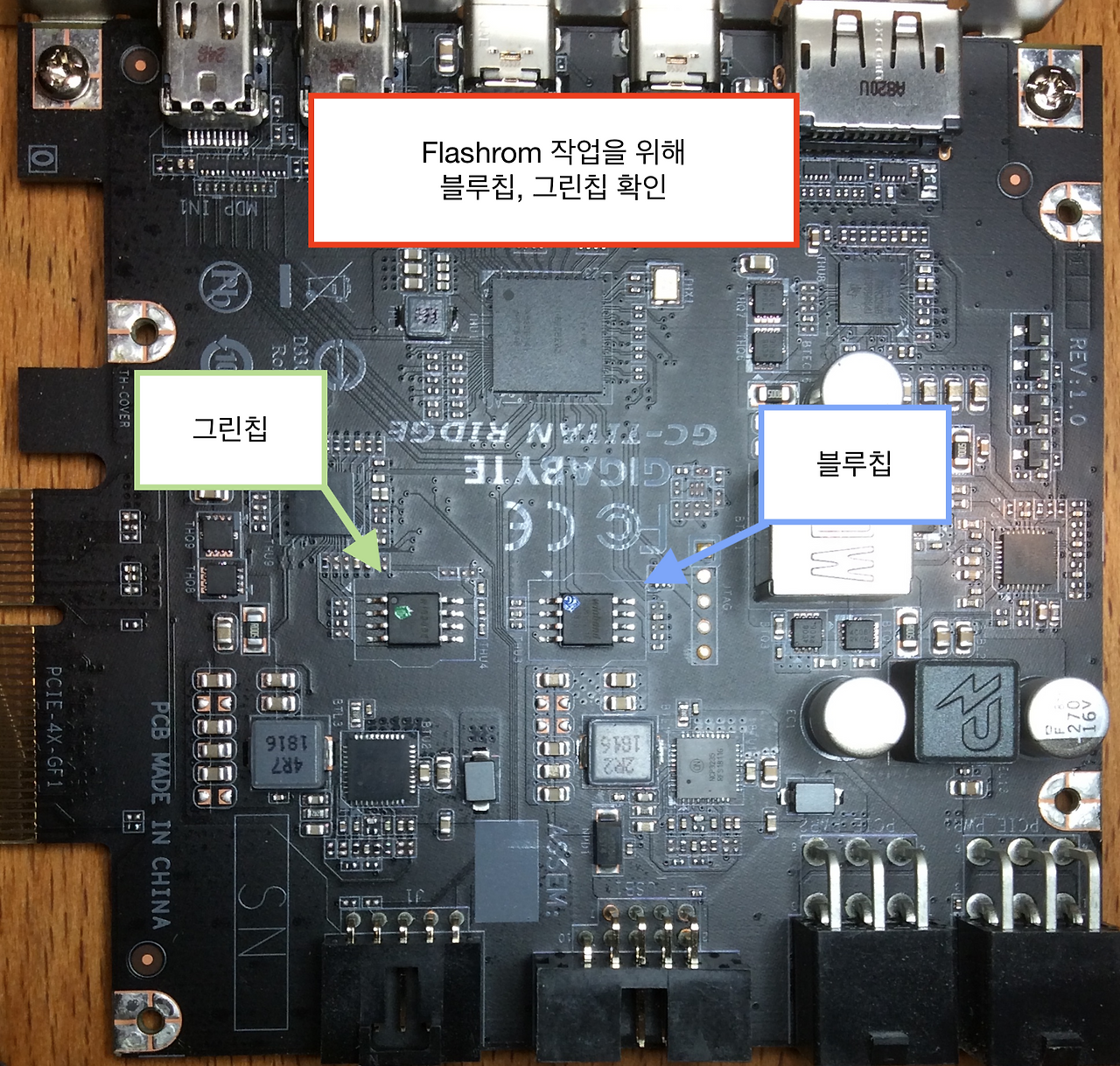 칩 위에 파란색 페인트와 녹색 페인트가 묻어 있으니 케이스만 잘 열었다면 칩이 헷갈릴 걱정은 하지 않아도 된다. 하지만 이 다음 작업은 flashrom 설치 작업이라 정신을 바짝 차려야 했다.