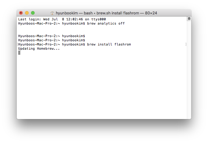 5) 터미널 창에서 brew install flashrom 을 입력한다.