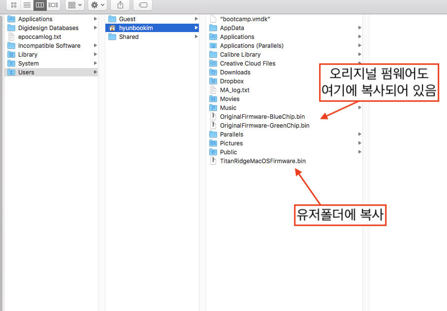 6) 자 그럼 다시 블루칩에 집게를 연결하고 드디어 TitanRidgeMacOSFirmware.bin 으로 플래시를 해 보자. 먼저 위에서 다운 받은 TitanRidgeMacOSFirmware.bin 파일을 유저 폴더에 복사하도록 하자. (유저 폴더에 TitanRidgeMacOSFirmware.bin을 복사하지 않아 펌웨어가 인식이 안되어 한참을 고민하고 좌절하고 빡침의 시간을 보냈다.)
