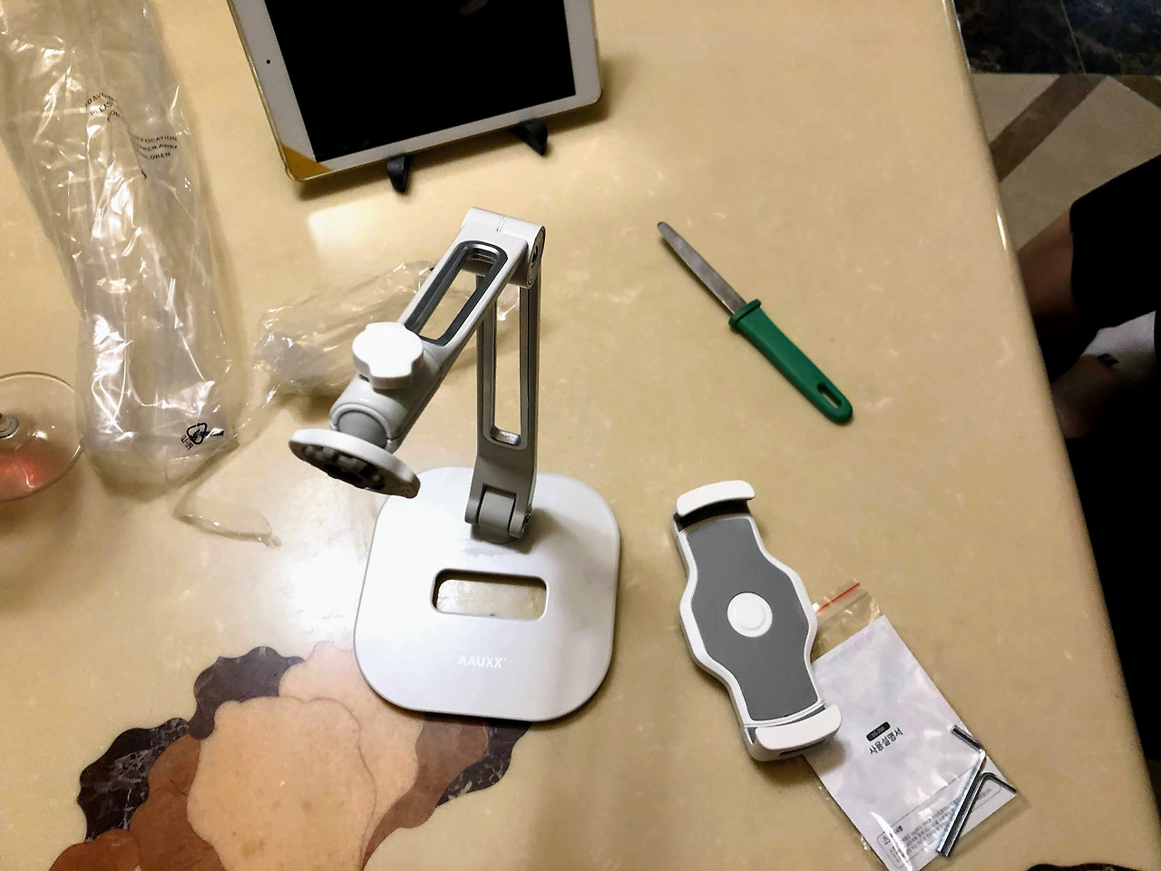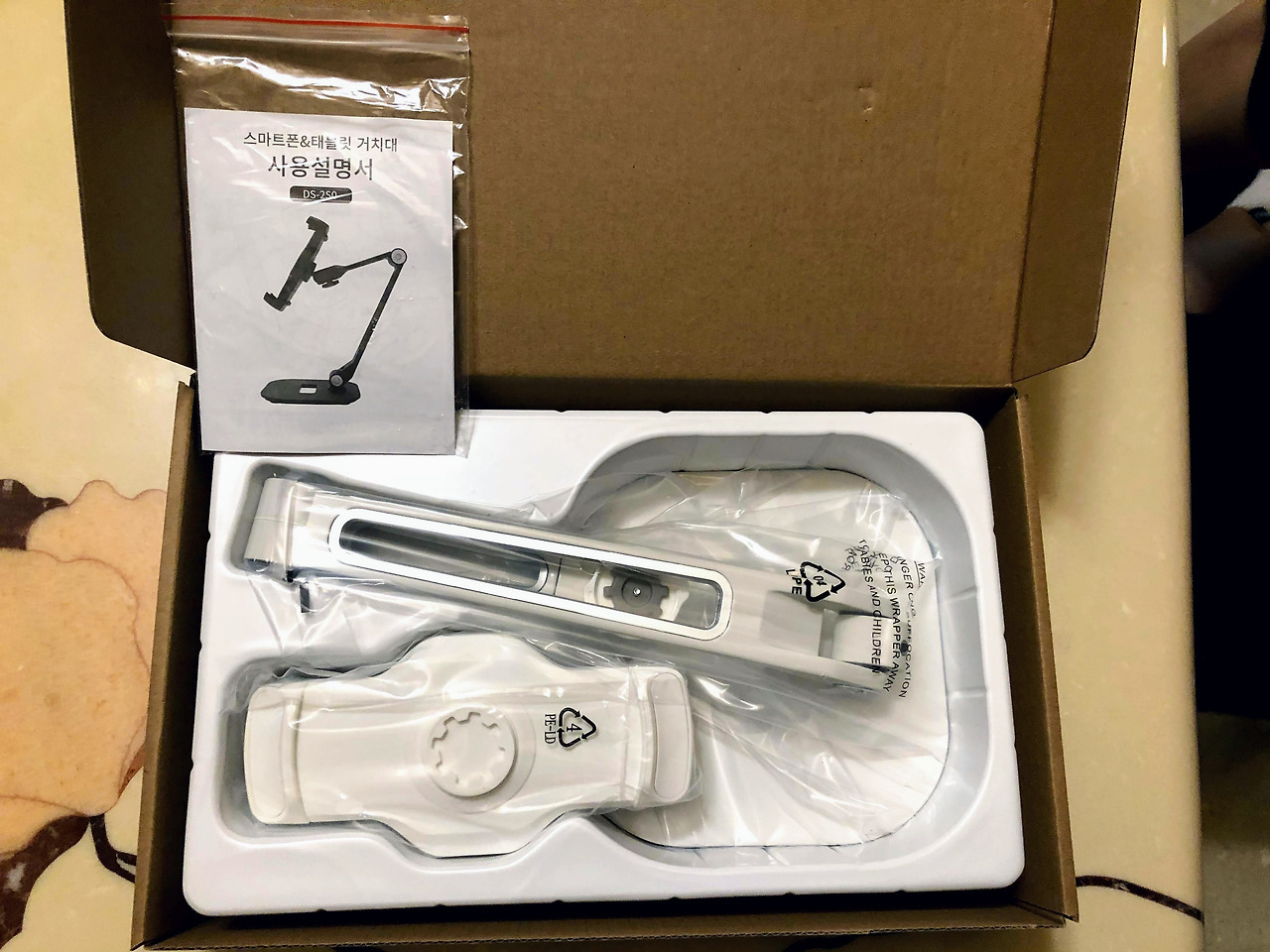 제품 박스를 열어보니 플라스틱 몰드 안에 거치대가 잘 놓여 있었다. 설명서도 지프백에 잘 보관되어 있었다. 설명서를 치워 놓고 바로 조립 시도! 하지만 와인을 마시던 중이라 조립중 망가지는 불상사를 막기위해 설명서를 읽었다.