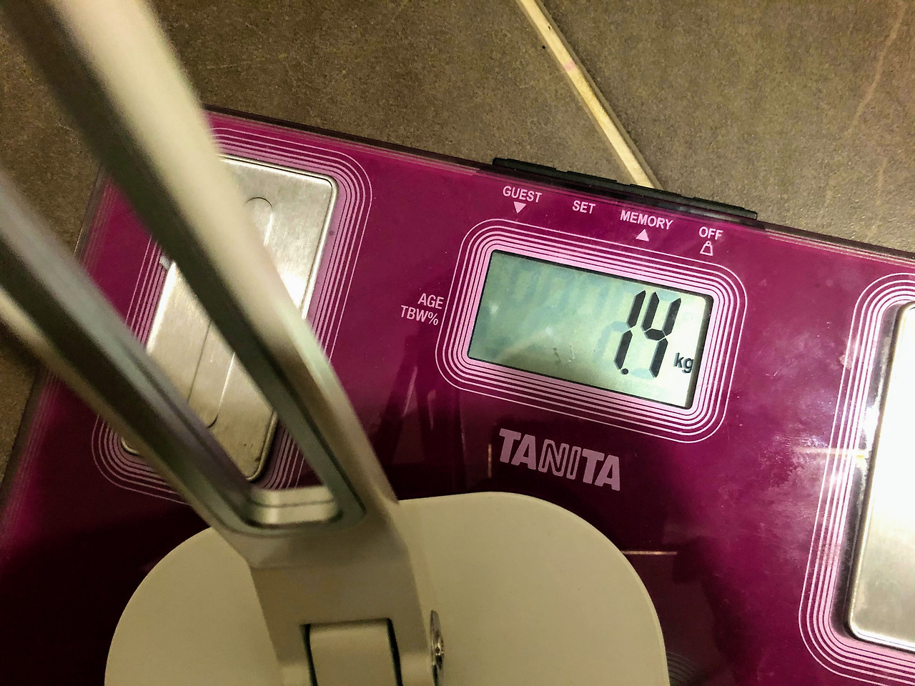 불안한 마음에 거치대를 들고 욕실로 출동! 무게를 달아보니 1.4kg! 거치대를 들고 다니는 것은 깨끗하게 포기! 하기로 했다. 난 무거운게 싫으니까 ㅎㅎ