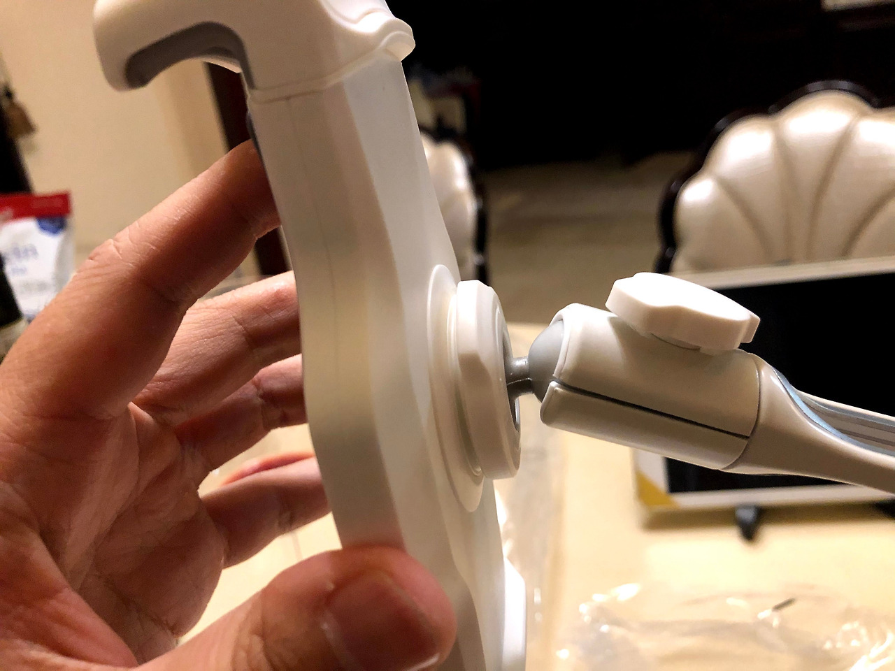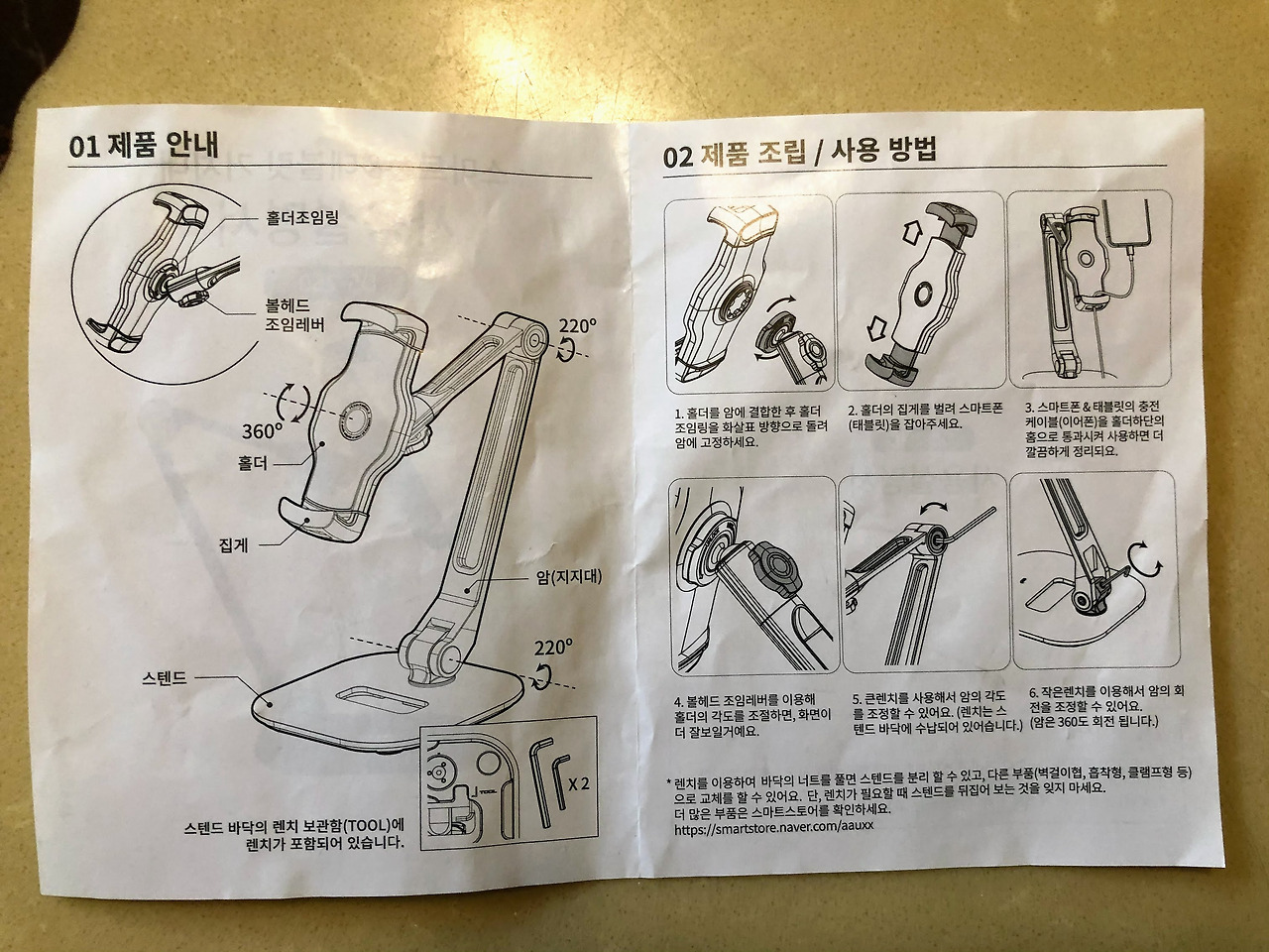 조립은 다 되어 있었지만 아이패드를 잡아주는 홀더를 암(지지대)에 끼워야 했다. 설명서를 읽어보니 '1. 홀더를 암에 결합한 후 홀더 조임링을 화살표 방향으로 돌려 암에 고정하세요'라고 설명해 놓았다. '오른쪽으로 돌아가는 화살표니 시계방향으로 돌리면 되는구나!'