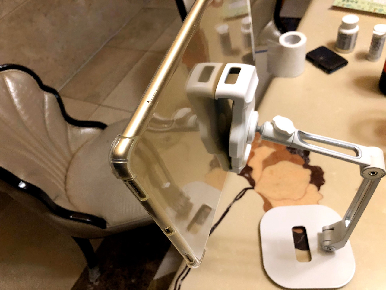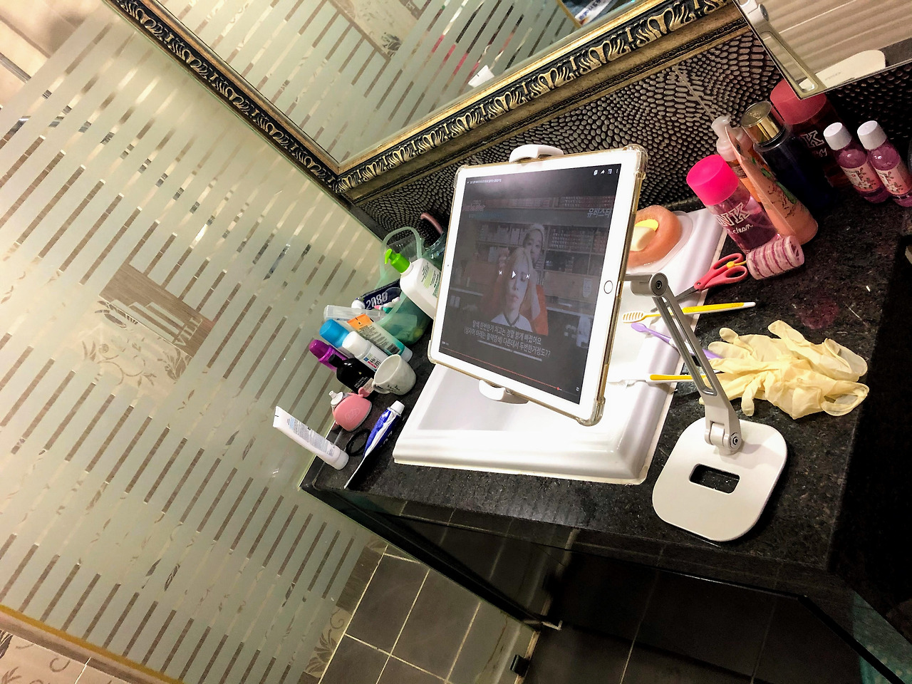 거치대의 무게가 묵직한 것이 어디에 놓아도 마음이 든든했다. 큰 딸아이 탈색하기 위해 욕실에서 아이패드로 유튜브를 볼 때도 마음이 든든! 각도도 높이도 자유롭게~