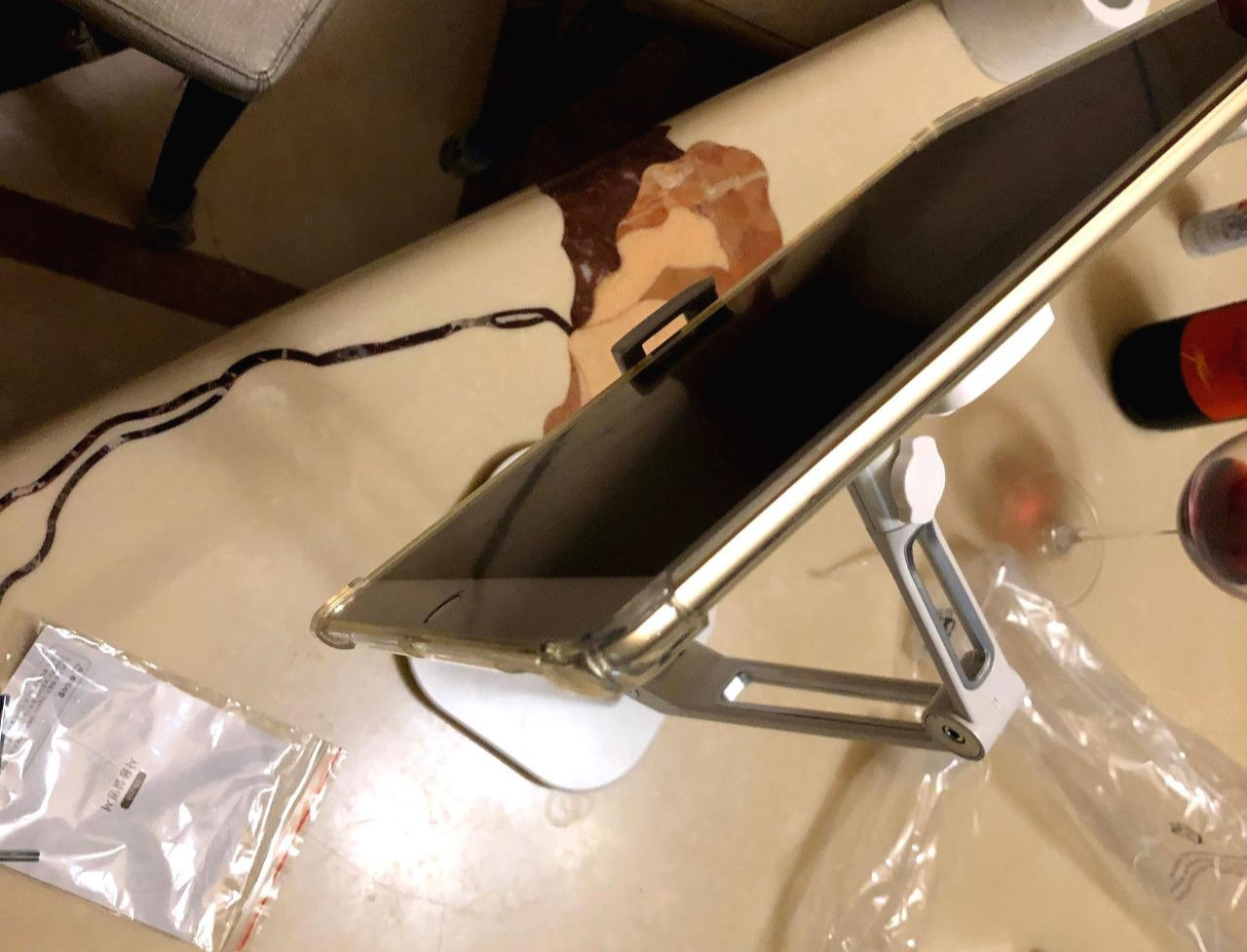 아이패드를 눈높이로 올려줄 수 있는 거치대는 특히 문서읽기나 동영상 시청때 필수적이다. 패드를 들고 화면을 보는 것은 거의 자학 수준이라 볼 수 있다. 내가 사용하는 아이패드 프로 1세대 12.9인치는 약 700그람 정도인데 700그람의 무게라도 계속 들고 있으면 내가 왜 이걸 들고 영화를 보고 있나? 하는 자괴감이 든다. 화면 높이를 딱 눈높이로 맞추어 줄 수 있는 거치대가 절실히 필요했다.