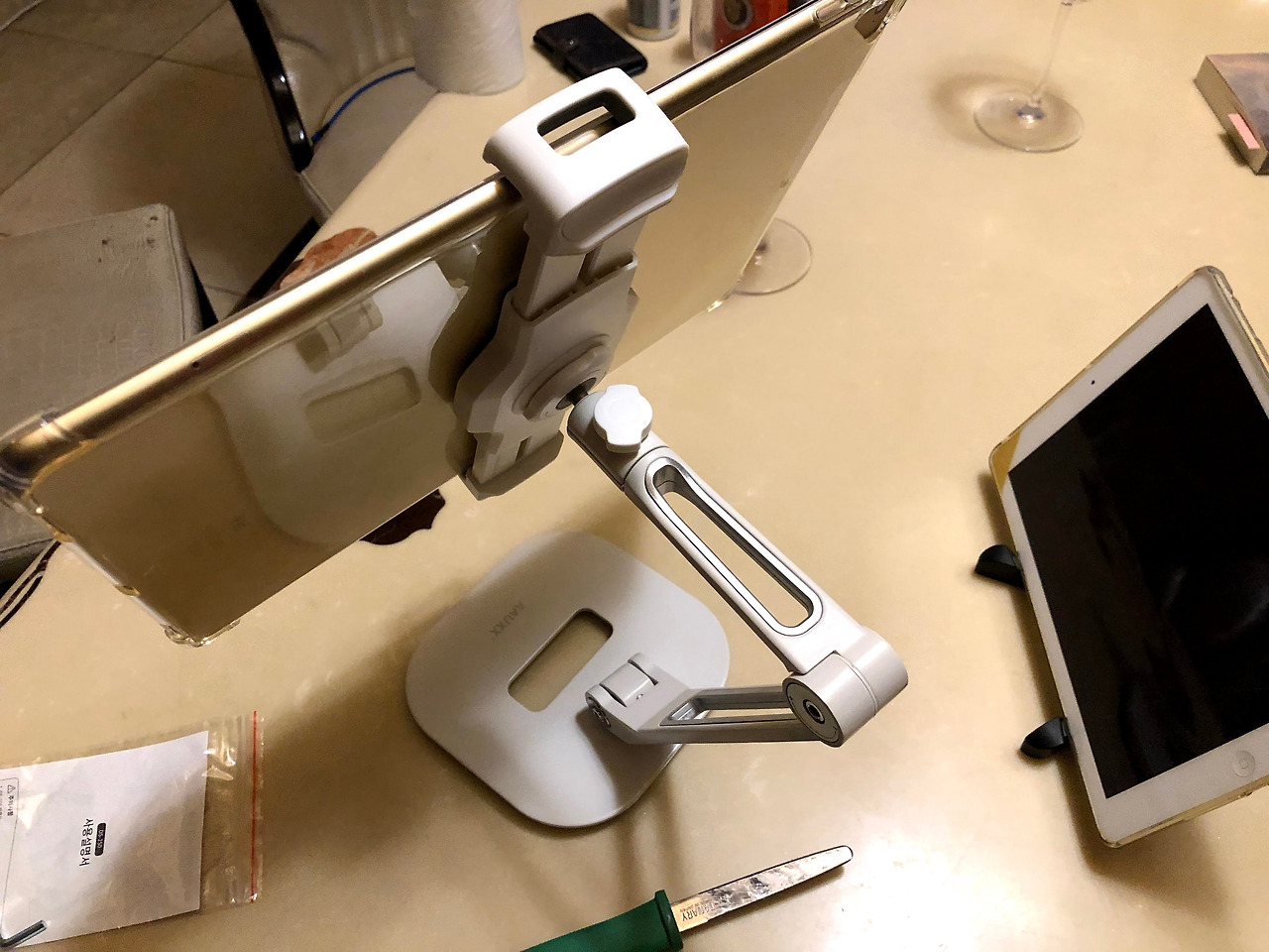 헤더를 최대한 늘리면 12.9인치 아이패드가 꽉 들어 맞는다. 그러니 다른 패드들은 아주 편하게 거치대에 장착할 수 있을 것이다. 2단으로 된 암은 적당히 조여져 있어 설명서와 함께 있는 육각렌치를 사용하지 않아도 높이 조절과 각도조절에는 문제가 없었다. 하지만 헤더와 암을 연결하는 부분에 있는 볼헤더 조임레버를 충분이 조이지 않으면 아이패드가 계속 고개를 숙여 볼헤더 조임레버는 최대한 꽉 조여야 했다. 손이 좀 아팠다. 하지만 눈높이로 보는 아이패드의 화면은 왠지 낮설었지만 고개도 눈도 편했다.