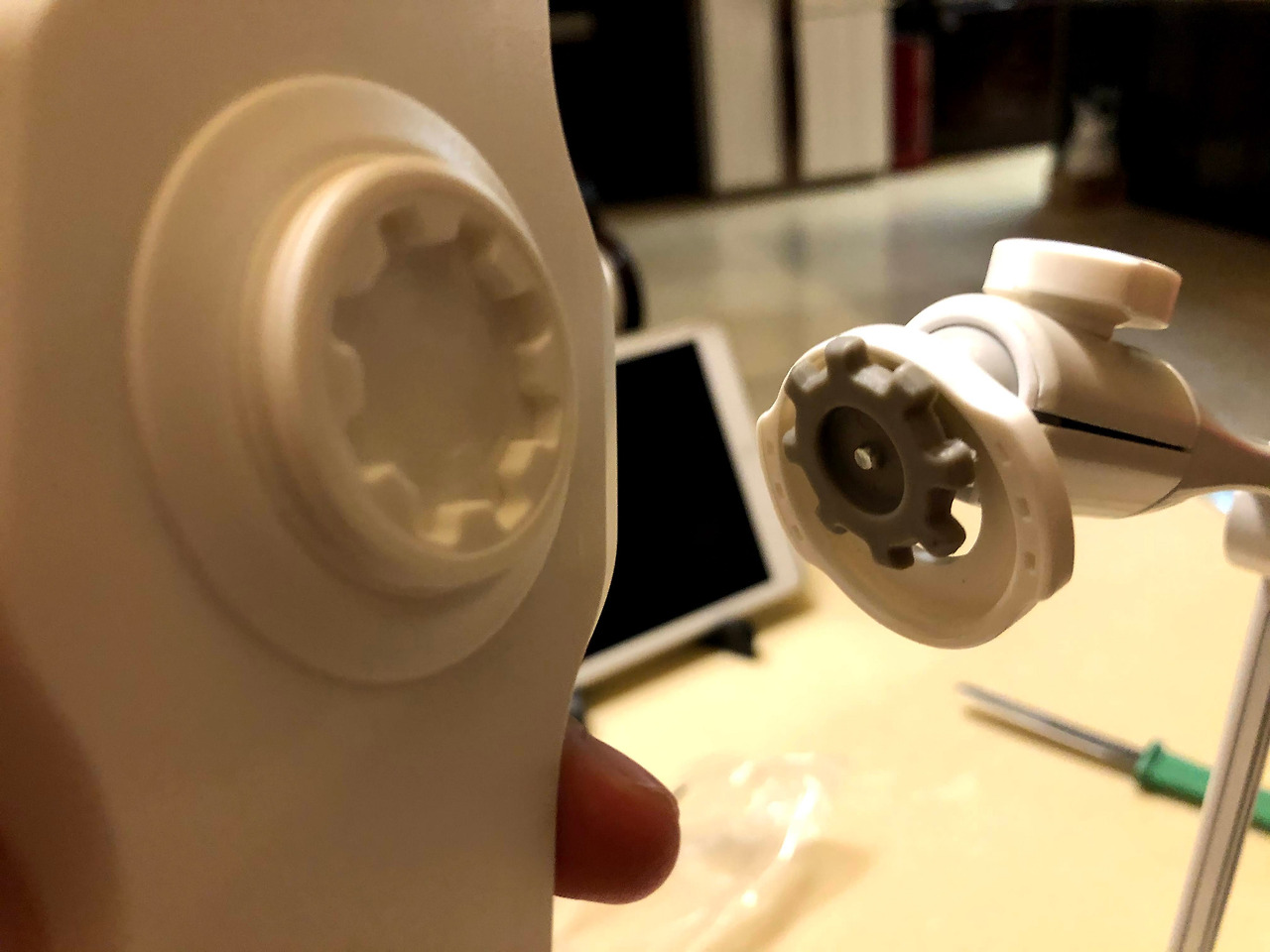암에 있는 톱이 모양과 홀더의 톱니 모양을 일치시킨 후 조임링을 시계 방향으로 두바퀴에서 세바퀴정도 돌리면 튼튼하게 장착되었다. '자, 다음은 아이패드를 끼워야지~'