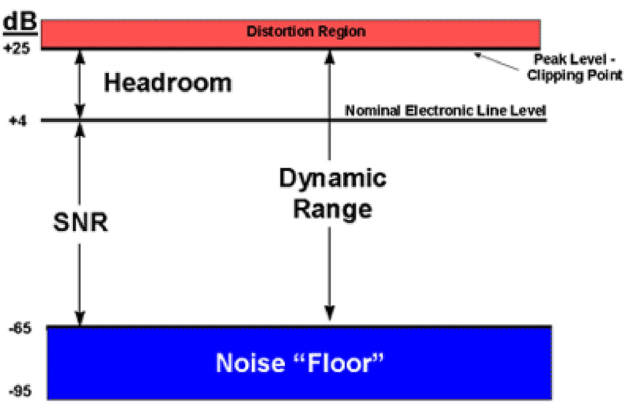 맨 왼쪽 dB 아래의 숫자들은 소리, 좀 더 정확하게 전압을 나타내는 단위이다. +4(+4dBu)는 일반적인 라인레벨 전압 즉 표준운용라인레벨(Nominal Electronic Line Level)이다. 프로페셔널 음향장비들은 이 전압을 기본라인레벨로 한다. 그림에서 보는 바와 같이 신호대잡음비(SNR, singal to noise ratio)가 높아지면 헤드룸(Headroom)이 낮아진다. 그럼 신호는 좀 더 소리가 왜곡되는 지점(Peak Level Clipping Point)에 가까워지고 이 지점을 지나면 소리가 왜곡(Distortion Region)된다. 기본노이즈에서 피크가 생기는 지점까지인 다이나믹레이지를 최대로 사용하면 좋지만 일반적으로는 신호대잡음비를 최대한으로 사용해야 하지만 소리의 왜곡을 막기위해 헤드룸 또한 확보해야 함 또한 인지하고 있어야 한다.