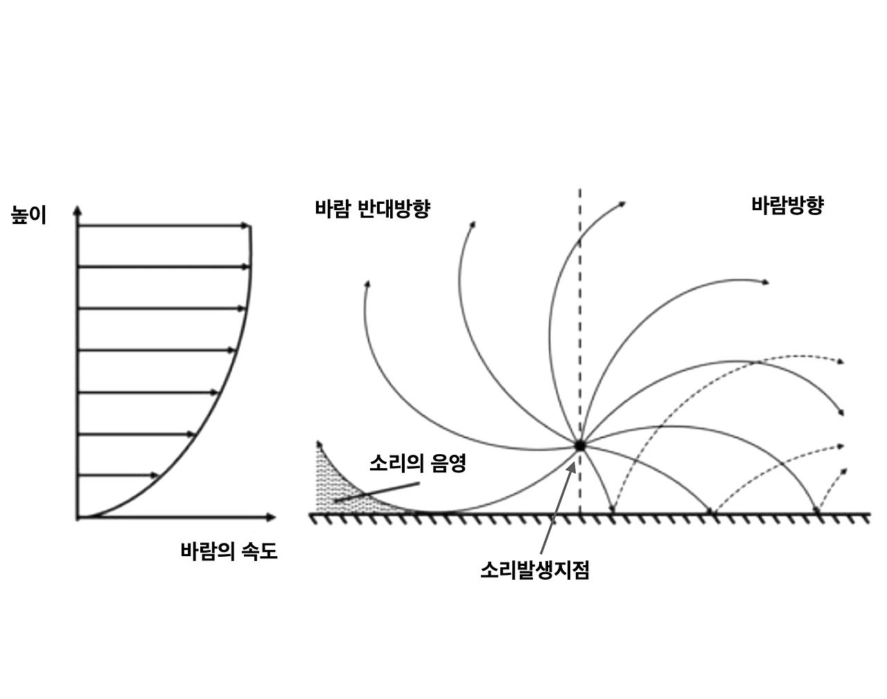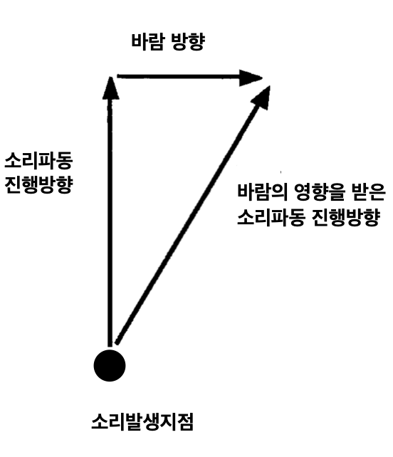소리의 파동은 바람의 영향을 받아 굴절하는데, 소리 파동 진행 방향 측면에서 바람이 불면 바람의 방향에 따라 굴절한다.
