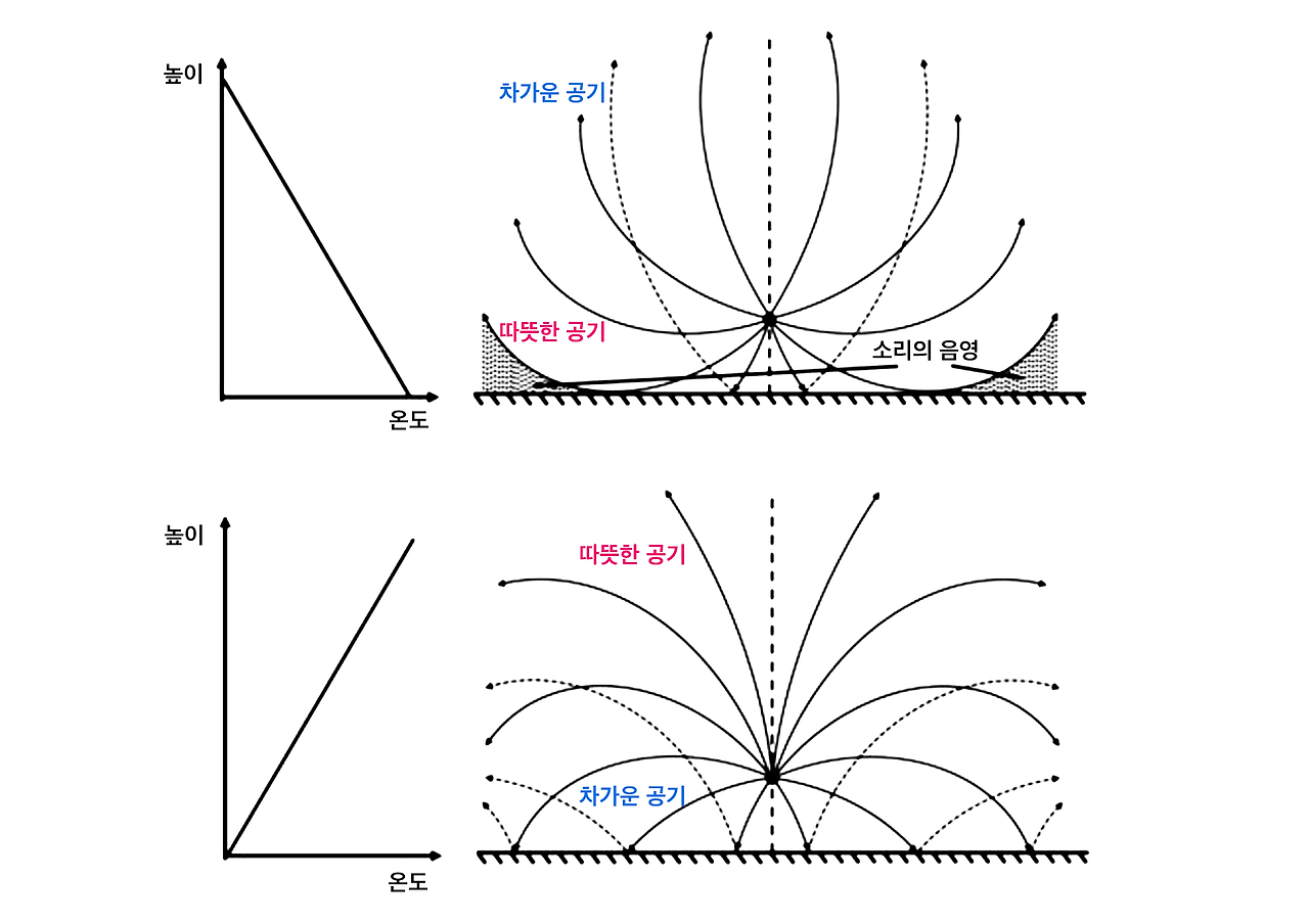 소리 파동은 온도가 낮은 방향을 굴절한다. 그 이유는 온도차로 인해 공기 입자의 밀도가 달라져 소리 파동이 다른 밀도를 가진 공기 입자를 지나며 파동의 속도와 방향이 달라지기 때문이다. 온도가 높아지면 공기 입자가 희박하여 파동의 속도가 빨라지고 온도가 낮아지면 공기 입자 밀도가 상대적으로 높아져 파동의 속도가 낮아진다. 스넬의 법칙에 의하면, 파동은 속도가 높은 매질(공기입자)에서 속도가 낮은 매질로 이동할 때 파동의 입사각 보다 굴절각이 감소하여 속도가 낮은 매질 방향으로 굴절하는데, 소리 파동은 높은 공기 입자 밀도를 가진 즉 낮은 속도의 매질인 차가운 공기 방향으로 굴절하는 원리이다.