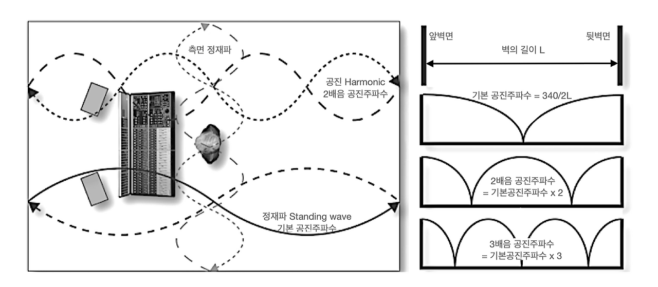 단단하고 매끄러운 두 벽이 평행으로 서로 마주하고 있다면 벽과 벽 사이의 거리와 같은 파장의 길이를 가진 주파수가 과도하게 울리는 현상이 발생하여 듣는 사람의 위치에 따라 그 주파수가 크게 들리기도 하고 약하게 들리기도 하는 정재파 standing wave가 만들어진다. 이런 공간은 마치 악기의 울림통과 같이 반응하여 배음 주파수들이 공진하며 그 공간만의 톡특한 울림인 룸 모드 room mode를 만든다.