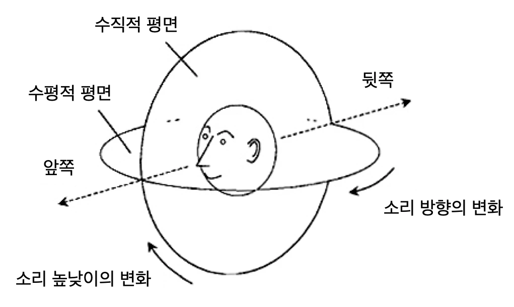 소리 발생지점 위치를 파악 할 수 있는 것은 좌,우뿐 아니라 위, 아래, 앞, 뒤의 위치도 파악할 수 있는데 이러한 청각 특성을 잘 활용한 것이 Dolby Atmos Binaural 이다.