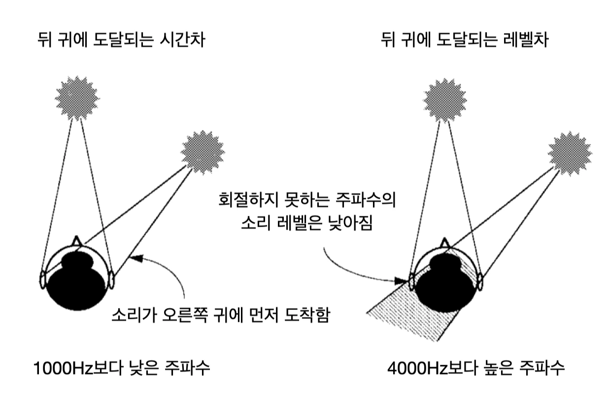 소리 발생지점에서 듣는 사람에게 가장 먼저 전달 되는 직접음은 소리 발생지점의 위치, 소리 크기, 음색을 인지하는 중요한 단서이다. 1000Hz 보다 낮은 주파수는 두 귀에 도달하는 소리의 시간차에 의해 위치를 파악하고 이를 ITD Interaural Time Difference라고 부른다. 4000Hz 보다 높은 소리는 머리 둘레 보다 짧은 파장의 길이를 가지 주파수는 회절 하지 못하기 때문에 혹은 에너지가 약해지기 때문에 두 귀에 도달하는 레벨 차이로 인해 소리의 위치를 파악할 수 있고 이를 ILD Interaural Level Difference라고 부른다.