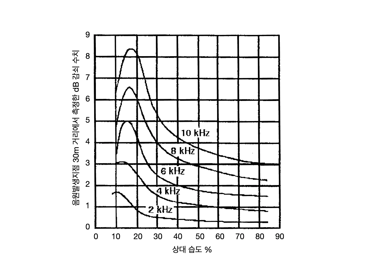 역자승의 법칙을 통해 소리 파동은 음원발생지점으로 부터 거리가 멀어질수록 파동에너지가 약해지는 것을 알게 되었다. 2kHz 이상의 고음은 거리에 따른 에너지 손실이 급격하게 높아진다. 특히 습도가 낮으면 낮을 수록 고음 주파수가 약해지는 현상이 강하게 나타난다. 예를 들어 상대습도 10~20%사이 10kHz 주파수는 음원발생지점에서 30m의 거리가 되면 8dB이상 약해지는 것을 위의 그래프를 통해 알 수 있다.
