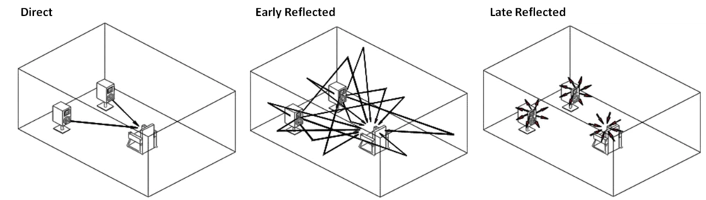 듣는 사람에게 가장 먼저 그리고 직접 전달되는 직접음은 가장 큰 에너지로 전달된다. 제일 크게 들린다는 말이다. 그리고 벽, 바닥, 천정에 반사되어 들리는 소리를 초기 반사음, 그리고 여러방향으로 반사된 소리가 어느 정도 지속적으로 울리는 소리를 잔향이라 부른다.