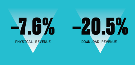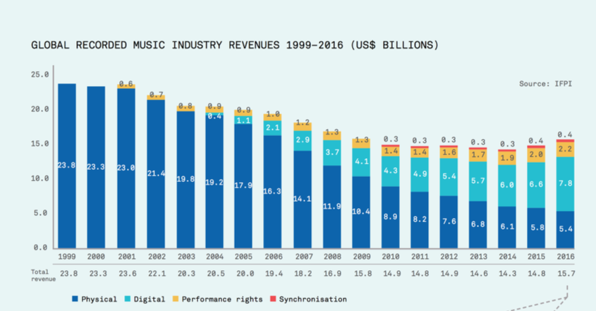 mp3의 등장과 인터넷의 발전 그리고 스트리밍의 확대로 인해 마이너스 성장을 거듭하다