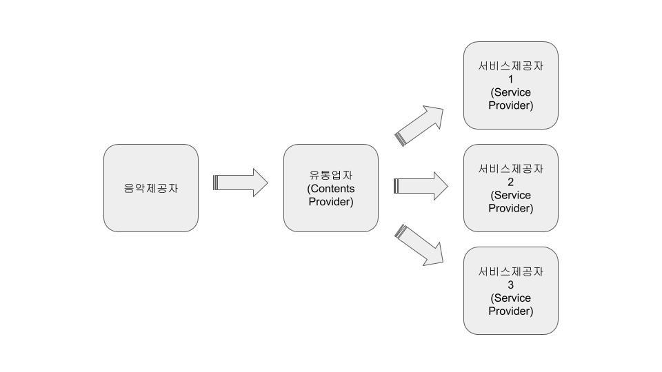 위의 그림과 같이 음악제공자 개인이든 사업자이건 음악이 멜론등의 서비스플랫폼에 올리기 위해서는 유통업자와 계약을 해야한다. 작게는 20% 많게는 50%까지 요구하는 유통업자도 있다.